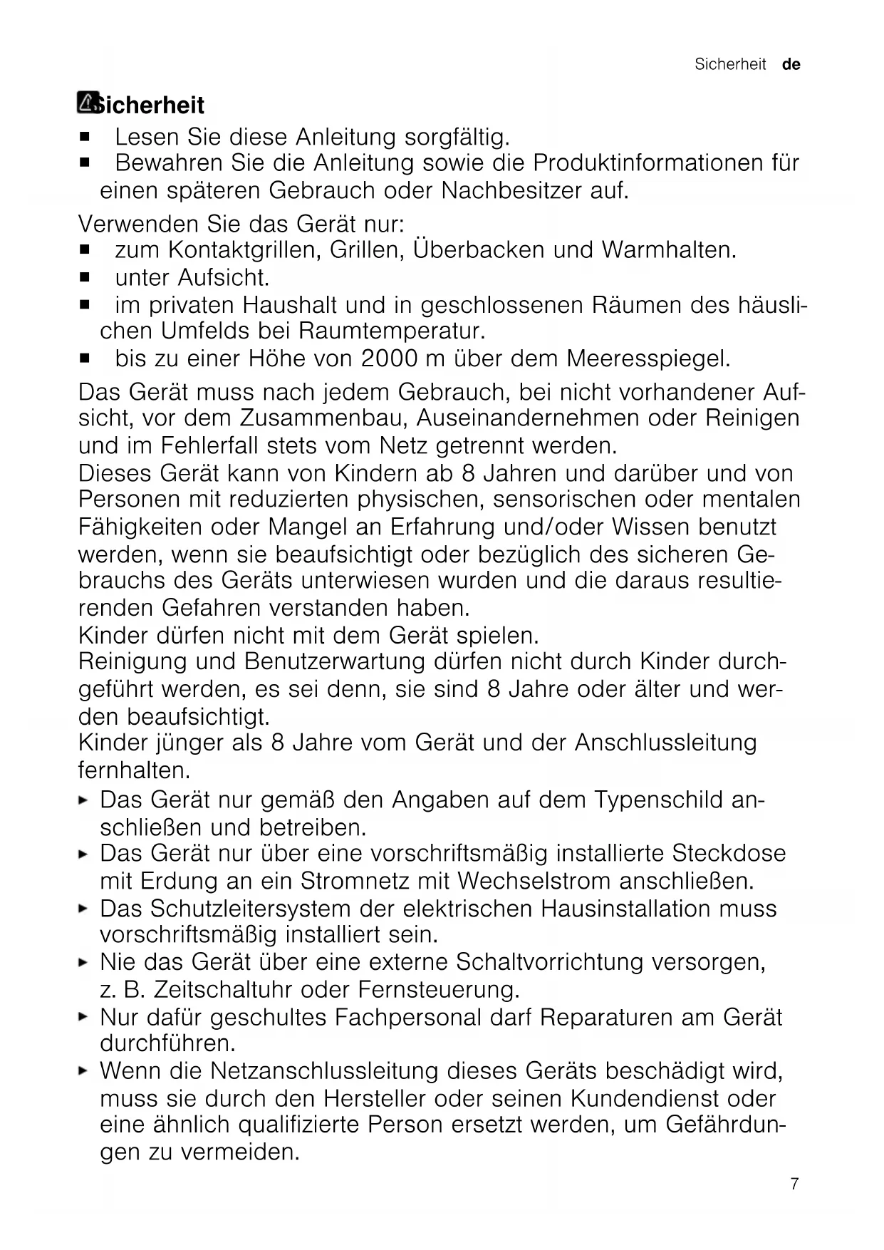 14 1516Sicherheit de Sicherheit Sicherheit ¡ Lesen Sie diese Anleitung sorgfältig. ¡ Bewahren Sie die Anleitung sowie die Produktinformationen für einen späteren Gebrauch oder Nachbesitzer auf. Verwenden Sie das Gerät nur: ¡ zum Kontaktgrillen, Grillen, Überbacken und Warmhalten. ¡ unter Aufsicht. ¡ im privaten Haushalt und in geschlossenen Räumen des häusli- chen Umfelds bei Raumtemperatur. ¡ bis zu einer Höhe von 2000m über dem Meeresspiegel. Das Gerät muss nach jedem Gebrauch, bei nicht vorhandener Auf- sicht, vor dem Zusammenbau, Auseinandernehmen oder Reinigen und im Fehlerfall stets vom Netz getrennt werden. Dieses Gerät kann von Kindern ab 8 Jahren und darüber und von Personen mit reduzierten physischen, sensorischen oder mentalen Fähigkeiten oder Mangel an Erfahrung und/oder Wissen benutzt werden, wenn sie beaufsichtigt oder bezüglich des sicheren Ge- brauchs des Geräts unterwiesen wurden und die daraus resultie- renden Gefahren verstanden haben. Kinder dürfen nicht mit dem Gerät spielen. Reinigung und Benutzerwartung dürfen nicht durch Kinder durch- geführt werden, es sei denn, sie sind 8 Jahre oder älter und wer- den beaufsichtigt. Kinder jünger als 8 Jahre vom Gerät und der Anschlussleitung fernhalten. Das Gerät nur gemäß den Angaben auf dem Typenschild an- schließen und betreiben. Das Gerät nur über eine vorschriftsmäßig installierte Steckdose mit Erdung an ein Stromnetz mit Wechselstrom anschließen. Das Schutzleitersystem der elektrischen Hausinstallation muss vorschriftsmäßig installiert sein. Nie das Gerät über eine externe Schaltvorrichtung versorgen, z.B. Zeitschaltuhr oder Fernsteuerung. Nur dafür geschultes Fachpersonal darf Reparaturen am Gerät durchführen. Wenn die Netzanschlussleitung dieses Geräts beschädigt wird, muss sie durch den Hersteller oder seinen Kundendienst oder eine ähnlich qualifizierte Person ersetzt werden, um Gefährdun- gen zu vermeiden. 7de Sachschäden vermeiden Nie das Gerät oder die Netzanschlussleitung in Wasser tauchen oder in den Geschirrspüler geben. Keinen Dampfreiniger oder Hochdruckreiniger verwenden, um das Gerät zu reinigen. Nie die Netzanschlussleitung mit heißen Teilen in Kontakt brin- gen oder über scharfe Kanten ziehen. Das Gerät wird während des Betriebs heiß. Nie die hei- ßen Oberflächen berühren. Während des Betriebs nur die Bedienelemente oder den Griff be- rühren. Vor der Reinigung oder dem Transport das Gerät abkühlen las- sen. Um Verletzungen zu vermeiden, das Gerät nur bestimmungsge- mäß verwenden. Verpackungsmaterial von Kindern fernhalten. Kinder nicht mit Verpackungsmaterial spielen lassen. Kleinteile von Kindern fernhalten. Kinder nicht mit Kleinteilen spielen lassen. Sachschäden vermeidenSachschäden vermeiden Nie den Grill ohne eingesetzte Grillplat- ten einschalten. Kein scharfes, spitzes oder metallisches Besteck auf den Grillplatten verwenden. Grillbesteck aus Holz oder Kunststoff verwenden. Immer die Fettauffangschalen unter die Fettabläufe stellen. Kein Speiseöl mit einem Rauchpunkt un- ter 180°C verwenden, z.B. natives Oli- venöl Extra, um Schäden an der Kera- mikbeschichtung zu vermeiden. Nie die Grillplatten ohne Lebensmittel weiter aufheizen, nachdem die einge- stellte Grilltemperatur erreicht ist. KennenlernenKennenlernen Übersicht Abb.