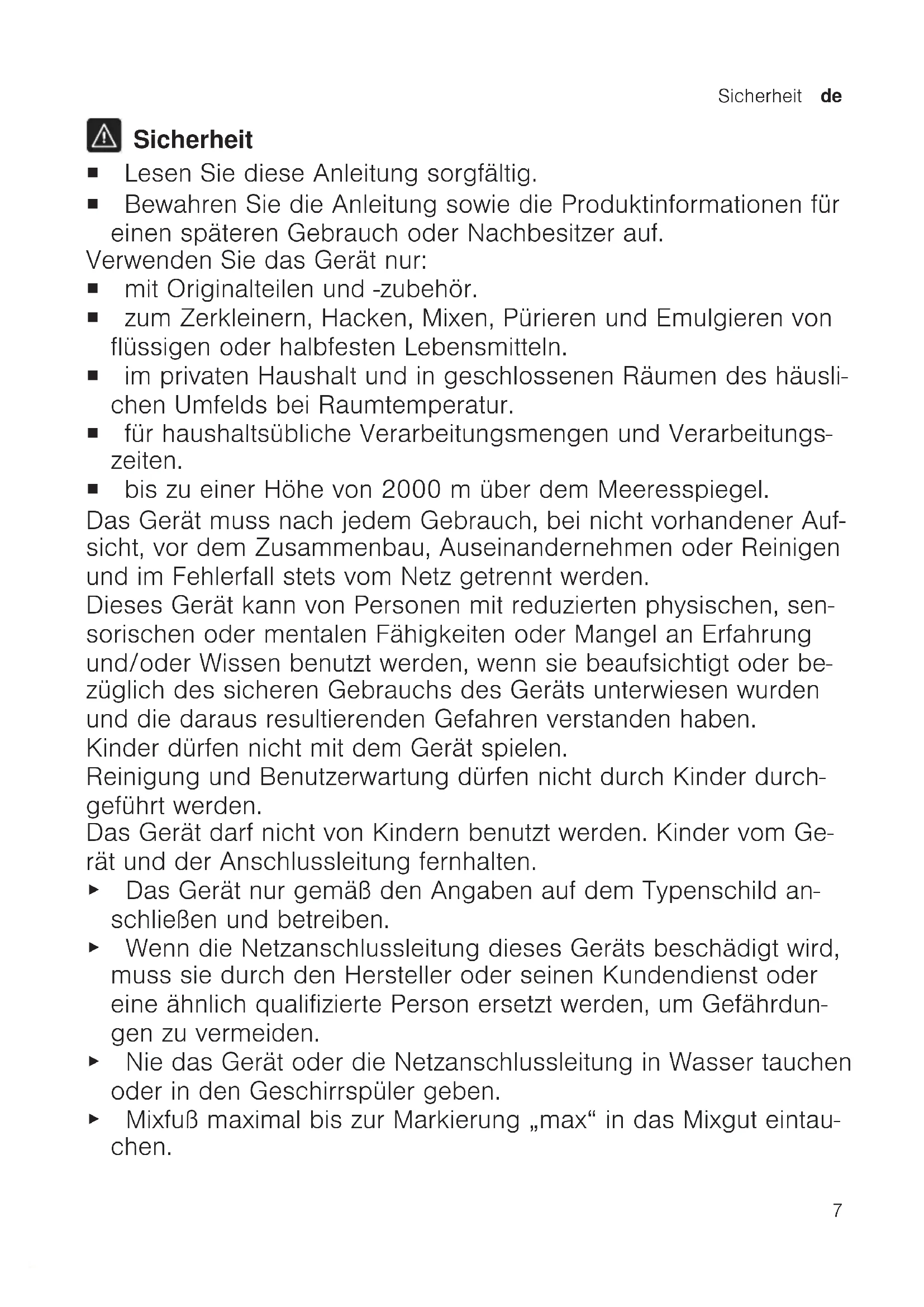Sicherheit ¡ Lesen Sie diese Anleitung sorgfältig. ¡ Bewahren Sie die Anleitung sowie die Produktinformationen für einen späteren Gebrauch oder Nachbesitzer auf. Verwenden Sie das Gerät nur: ¡ mit Originalteilen und -zubehör. ¡ zum Zerkleinern, Hacken, Mixen, Pürieren und Emulgieren von flüssigen oder halbfesten Lebensmitteln. ¡ im privaten Haushalt und in geschlossenen Räumen des häusli- chen Umfelds bei Raumtemperatur. ¡ für haushaltsübliche Verarbeitungsmengen und Verarbeitungs- zeiten. ¡ bis zu einer Höhe von 2000m über dem Meeresspiegel. Das Gerät muss nach jedem Gebrauch, bei nicht vorhandener Auf- sicht, vor dem Zusammenbau, Auseinandernehmen oder Reinigen und im Fehlerfall stets vom Netz getrennt werden. Dieses Gerät kann von Personen mit reduzierten physischen, sen- sorischen oder mentalen Fähigkeiten oder Mangel an Erfahrung und/oder Wissen benutzt werden, wenn sie beaufsichtigt oder be- züglich des sicheren Gebrauchs des Geräts unterwiesen wurden und die daraus resultierenden Gefahren verstanden haben. Kinder dürfen nicht mit dem Gerät spielen. Reinigung und Benutzerwartung dürfen nicht durch Kinder durch- geführt werden. Das Gerät darf nicht von Kindern benutzt werden. Kinder vom Ge- rät und der Anschlussleitung fernhalten. ▶ Das Gerät nur gemäß den Angaben auf dem Typenschild an- schließen und betreiben. ▶ Wenn die Netzanschlussleitung dieses Geräts beschädigt wird, muss sie durch den Hersteller oder seinen Kundendienst oder eine ähnlich qualifizierte Person ersetzt werden, um Gefährdun- gen zu vermeiden. ▶ Nie das Gerät oder die Netzanschlussleitung in Wasser tauchen oder in den Geschirrspüler geben. ▶ Mixfuß maximal bis zur Markierung „max“ in das Mixgut eintau- chen.de Sachschäden vermeiden