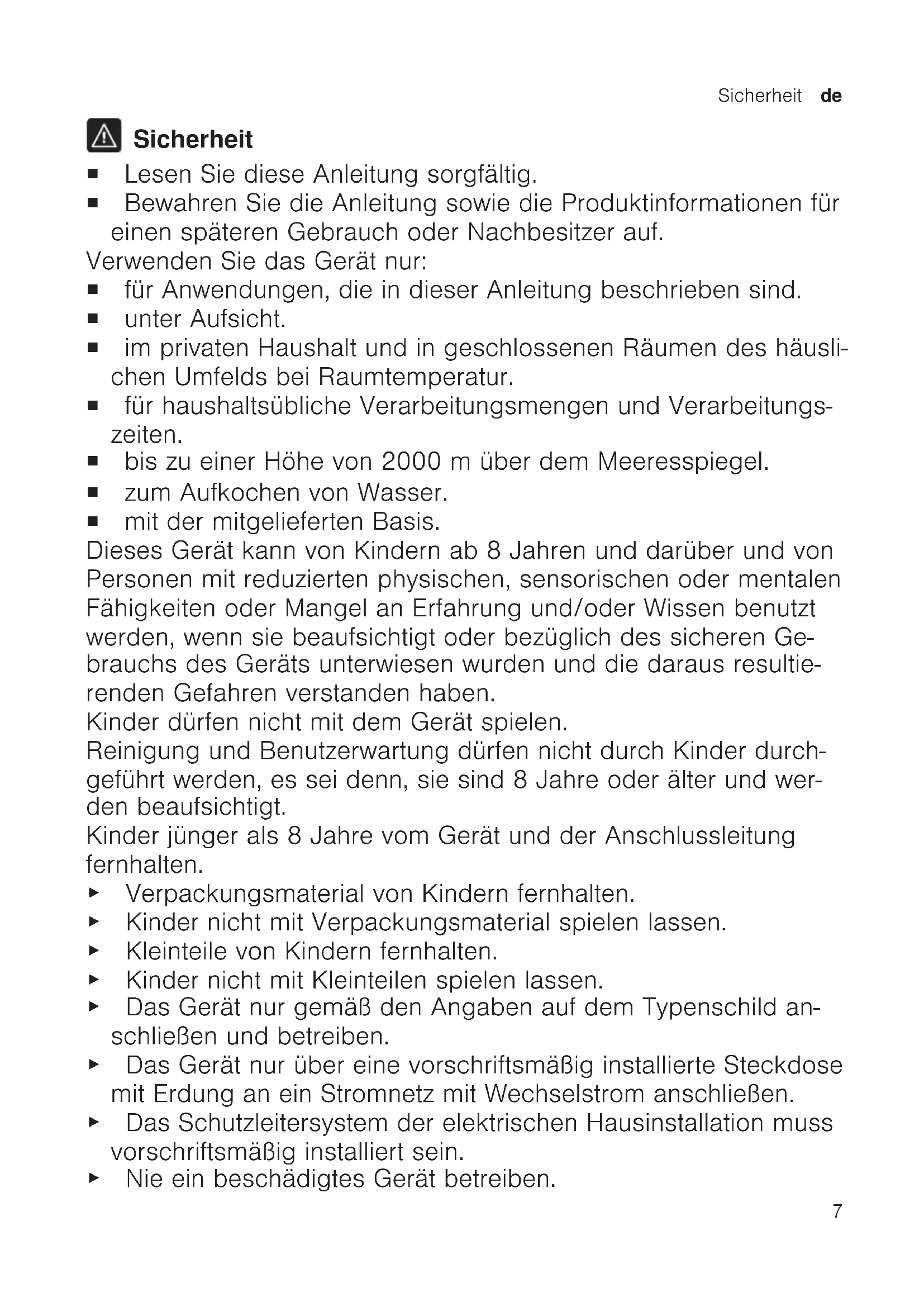 Sicherheit ¡ Lesen Sie diese Anleitung sorgfältig. ¡ Bewahren Sie die Anleitung sowie die Produktinformationen für einen späteren Gebrauch oder Nachbesitzer auf. Verwenden Sie das Gerät nur: ¡ für Anwendungen, die in dieser Anleitung beschrieben sind. ¡ unter Aufsicht. ¡ im privaten Haushalt und in geschlossenen Räumen des häusli- chen Umfelds bei Raumtemperatur. ¡ für haushaltsübliche Verarbeitungsmengen und Verarbeitungs- zeiten. ¡ bis zu einer Höhe von 2000m über dem Meeresspiegel. ¡ zum Aufkochen von Wasser. ¡ mit der mitgelieferten Basis. Dieses Gerät kann von Kindern ab 8 Jahren und darüber und von Personen mit reduzierten physischen, sensorischen oder mentalen Fähigkeiten oder Mangel an Erfahrung und/oder Wissen benutzt werden, wenn sie beaufsichtigt oder bezüglich des sicheren Ge- brauchs des Geräts unterwiesen wurden und die daraus resultie- renden Gefahren verstanden haben. Kinder dürfen nicht mit dem Gerät spielen. Reinigung und Benutzerwartung dürfen nicht durch Kinder durch- geführt werden, es sei denn, sie sind 8 Jahre oder älter und wer- den beaufsichtigt. Kinder jünger als 8 Jahre vom Gerät und der Anschlussleitung fernhalten. ▶ Verpackungsmaterial von Kindern fernhalten. ▶ Kinder nicht mit Verpackungsmaterial spielen lassen. ▶ Kleinteile von Kindern fernhalten. ▶ Kinder nicht mit Kleinteilen spielen lassen. ▶ Das Gerät nur gemäß den Angaben auf dem Typenschild an- schließen und betreiben. ▶ Das Gerät nur über eine vorschriftsmäßig installierte Steckdose mit Erdung an ein Stromnetz mit Wechselstrom anschließen. ▶ Das Schutzleitersystem der elektrischen Hausinstallation muss vorschriftsmäßig installiert sein. ▶ Nie ein beschädigtes Gerät betreiben.de Sachschäden vermeiden