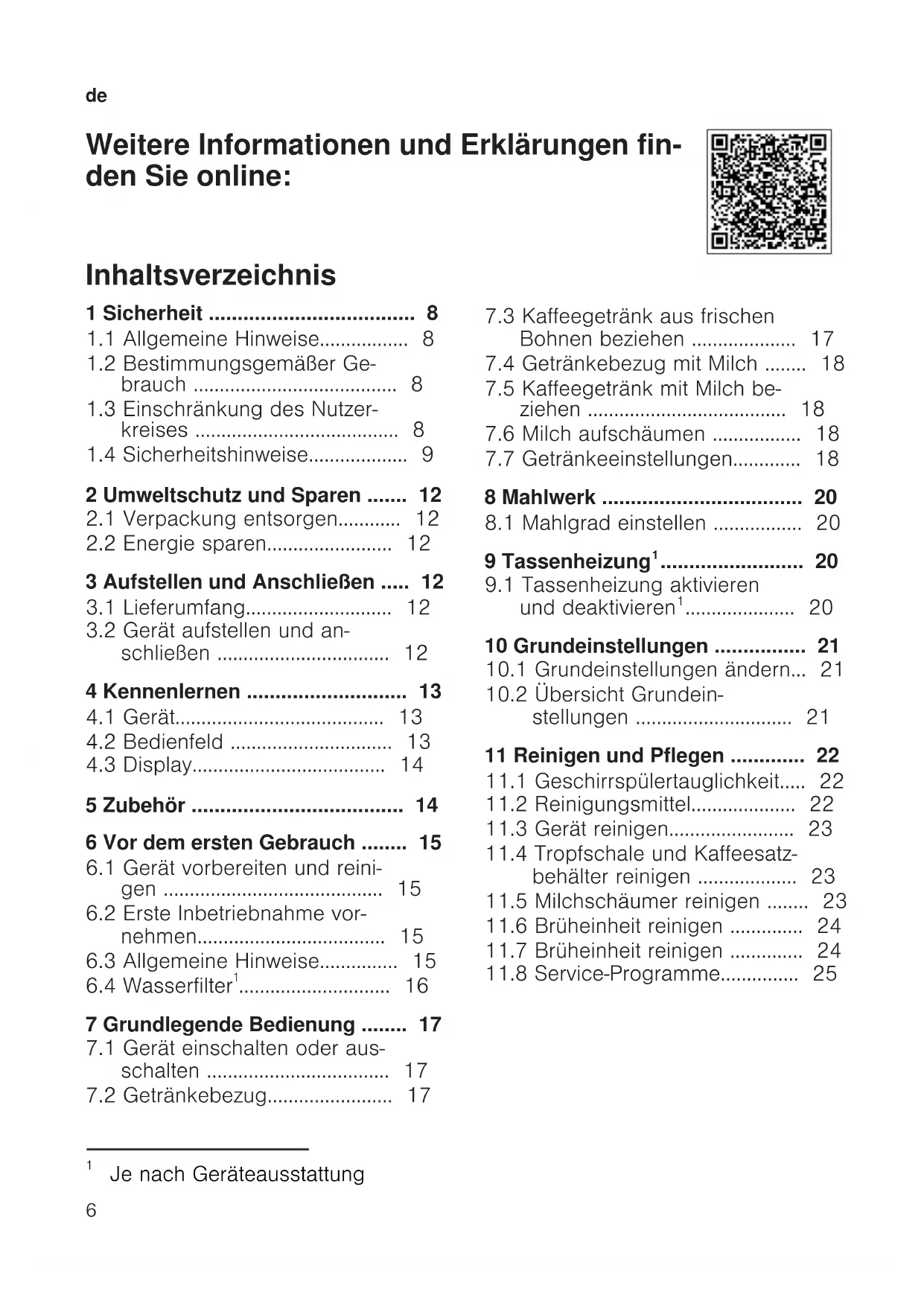 ▶ Den Hautkontakt mit austretenden Flüssigkeiten und Dämpfen vermeiden. WARNUNG‒Verletzungsgefahr! Eine Fehlanwendung des Geräts kann den Benutzer gefährden. ▶ Um Verletzungen zu vermeiden, das Gerät nur bestimmungsge- mäß verwenden. Einklemmen der Finger beim Schließen der Gerätetür. ▶ Beim Schließen der Gerätetür auf die Finger achten. Das Mahlwerk rotiert. ▶ Nie in das Mahlwerk fassen. WARNUNG‒Gefahr durch Magnetismus! Das Gerät enthält Permanentmagnete. Diese können elektroni- sche Implantate, z.B. Herzschrittmacher oder Insulinpumpen be- einflussen. ▶ Personen mit elektronischen Implantaten müssen 10 cm Min- destabstand zum Gerät einhalten. ▶ Den Mindestabstand von 10 cm auch zum entnommenen Was- sertank einhalten. WARNUNG‒Gefahr von Gesundheitsschäden! Verschmutzungen am Gerät können die Gesundheit gefährden. ▶ Die Reinigungshinweise zur Hygiene zum Gerät beachten.de Umweltschutz und Sparen