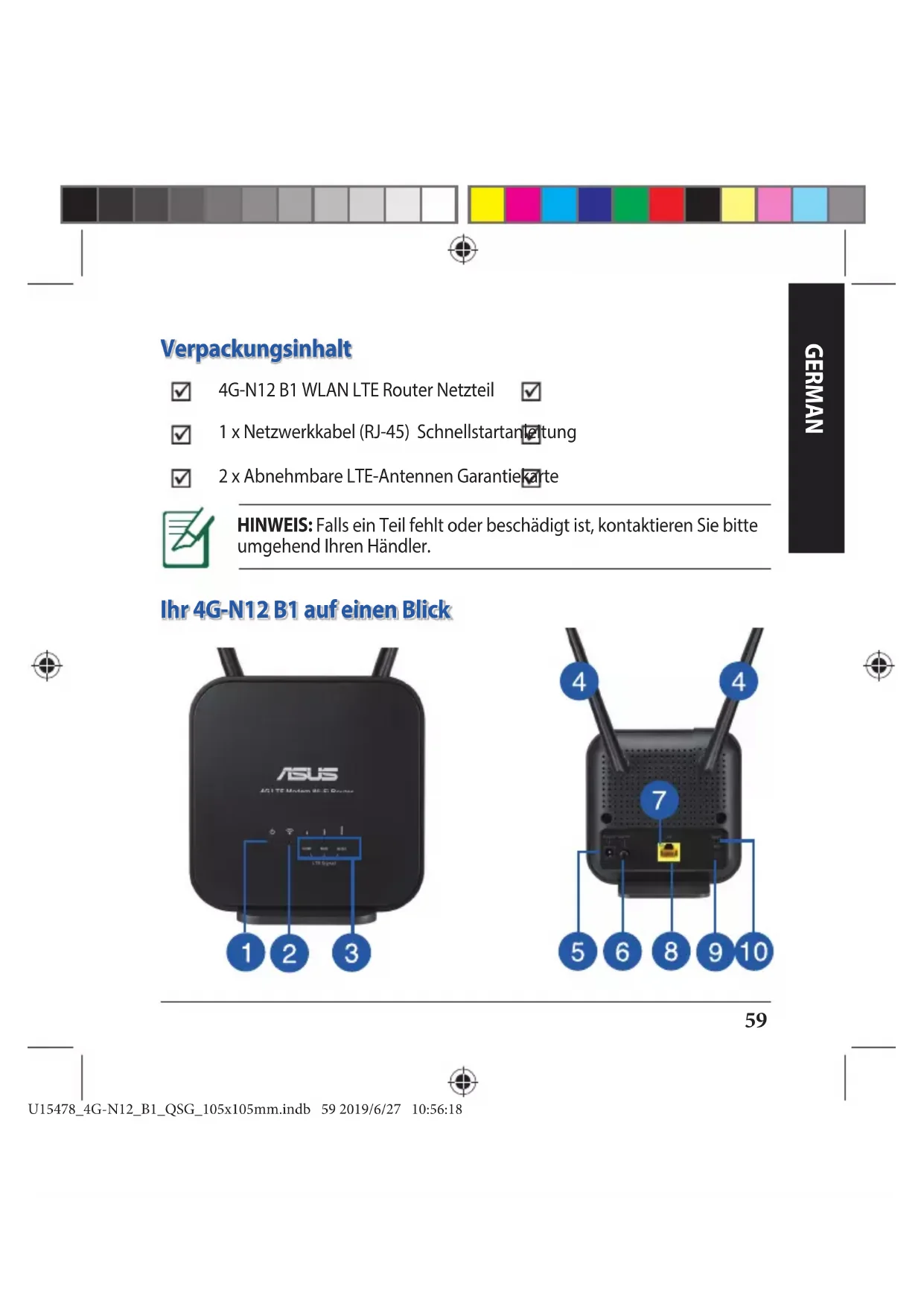 HINWEIS: Falls ein Teil fehlt oder beschädigt ist, kontaktieren Sie bitte umgehend Ihren Händler. Verpackungsinhalt 4G-N12 B1 WLAN LTE Router Netzteil 1 x Netzwerkkabel (RJ-45) Schnellstartanleitung 2 x Abnehmbare LTE-Antennen Garantiekarte Ihr 4G-N12 B1 auf einen Blick Deutsch U15478_4G-N12_B1_QSG_105x105mm.indb 59 2019/6/27 10:56:18GERMAN