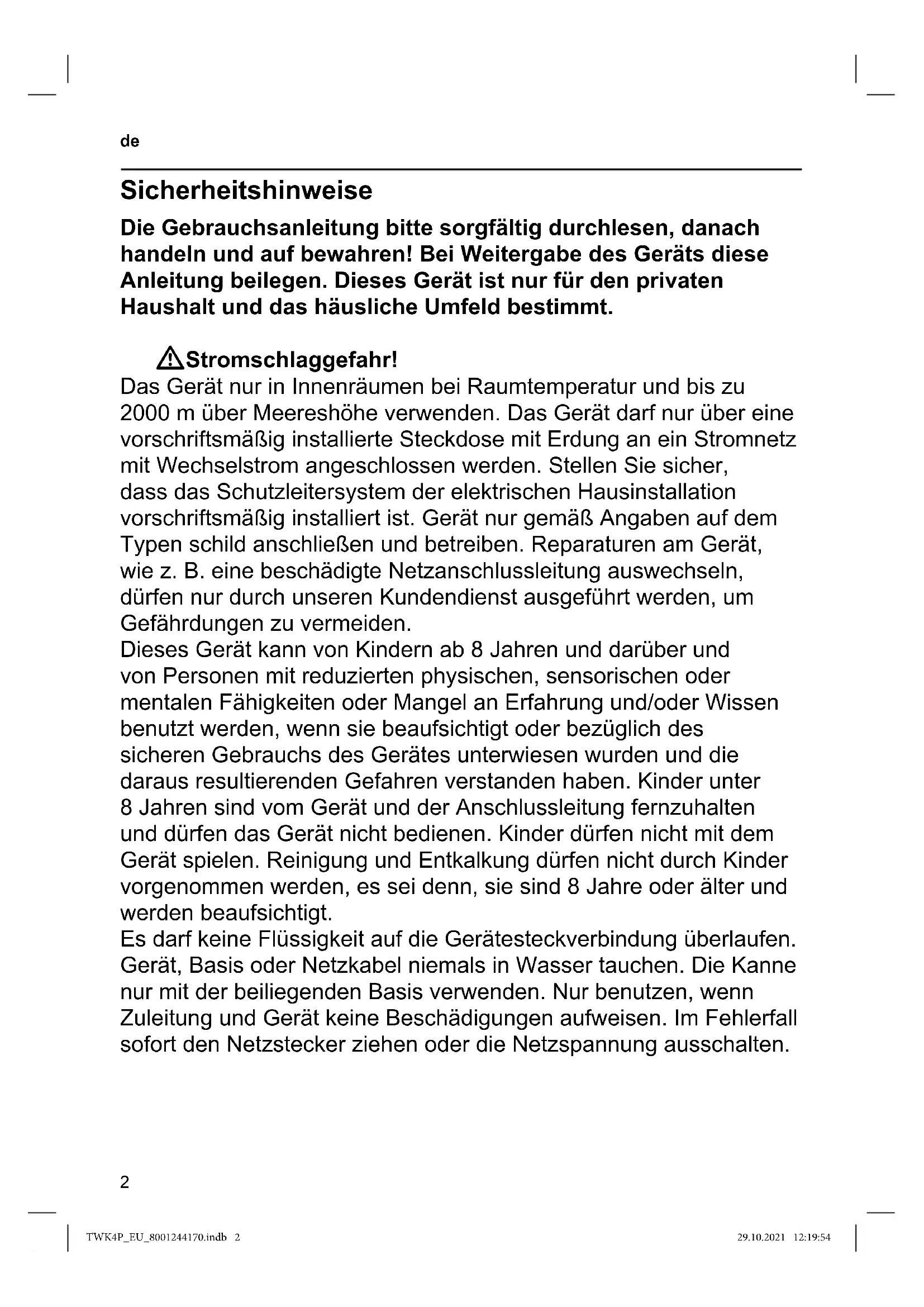 Sicherheitshinweise Die Gebrauchsanleitung bitte sorgfältig durchlesen, danach handeln und auf bewahren! Bei Weitergabe des Geräts diese Anleitung beilegen. Dieses Gerät ist nur für den privaten Haushalt und das häusliche Umfeld bestimmt. WStromschlaggefahr! Das Gerät nur in Innenräumen bei Raumtemperatur und bis zu 2000 m über Meereshöhe verwenden. Das Gerät darf nur über eine vorschriftsmäßig installierte Steckdose mit Erdung an ein Stromnetz mit Wechselstrom angeschlossen werden. Stellen Sie sicher, dass das Schutzleitersystem der elektrischen Hausinstallation vorschriftsmäßig installiert ist. Gerät nur gemäß Angaben auf dem Typen schild anschließen und betreiben. Reparaturen am Gerät, wie z. B. eine beschädigte Netzanschlussleitung auswechseln, dürfen nur durch unseren Kundendienst ausgeführt werden, um Gefährdungen zu vermeiden. Dieses Gerät kann von Kindern ab 8 Jahren und darüber und von Personen mit reduzierten physischen, sensorischen oder mentalen Fähigkeiten oder Mangel an Erfahrung und/oder Wissen benutzt werden, wenn sie beaufsichtigt oder bezüglich des sicheren Gebrauchs des Gerätes unterwiesen wurden und die daraus resultierenden Gefahren verstanden haben. Kinder unter 8 Jahren sind vom Gerät und der Anschlussleitung fernzuhalten und dürfen das Gerät nicht bedienen. Kinder dürfen nicht mit dem Gerät spielen. Reinigung und Entkalkung dürfen nicht durch Kinder vorgenommen werden, es sei denn, sie sind 8 Jahre oder älter und werden beaufsichtigt. Es darf keine Flüssigkeit auf die Gerätesteckverbindung überlaufen. Gerät, Basis oder Netzkabel niemals in Wasser tauchen. Die Kanne nur mit der beiliegenden Basis verwenden. Nur benutzen, wenn Zuleitung und Gerät keine Beschädigungen aufweisen. Im Fehlerfall sofort den Netzstecker ziehen oder die Netzspannung ausschalten. TWK4P_EU_8001244170.indb 2TWK4P_EU_8001244170.indb 2 29.10.2021 12:19:5429.10.2021 12:19:543