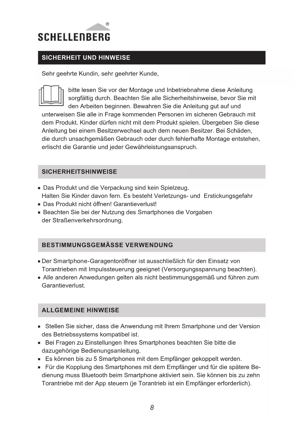 DerSmartphone-Garagentoröner(Art.Nr. 60990, 60991) erfüllt die gelten- den Anforderungen der europäischen und nationalen Richtlinien Die Konformität wurde nachgewiesen Der vollständige Text der EU-Konformitätserklärung ist unter der folgenden Internetadresse verfügbar: http://www.schellenberg.de (Menüpunkt „Service“ im Download-Center) Für den Betrieb in EU/EFTA-Mitgliedsstaaten zugelassen NichtimHausmüllentsorgen!DasProduktistrecyclingfähig undkannimWertstohofoderaneineranderenSammelstellefür elektrischen Hausmüll abgegeben werden WEEE-Richtlinie 2012/19/EU Funkanlagenrichtlinie 2014/53/EU RoHS-Richtlinie 2011/65/EU EMV-Richtlinie 2014/30/EU GERÄTEANFORDERUNG Smartphone: - Android - ab Version 43 - IOS - ab Version 711010 TECHNISCHE DATEN Gehäuse 59 x 49 x 20 mm Kabel 4-farbig, 400 mm Länge, Steckverbinder Antenne 7 dBi, 295 mm, SMA60 Sendeleistung < 10 mW Frequenz 2,4 GHz Reichweite ca. 15 m Spannungsversorgung 6 V bis 36 V DC max. Stromaufnahme 5 mA DC Betriebstemperatur -20 bis 55 °C Schutzklasse IP20 LED BLINKMUSTER Standby: LED leuchtet dauerhaft Kopplungsbereitschaft (nach Tastbetätigung): LED blinkt 0,5 s an / 0,5 s aus Gekoppelt mit Smartphone: LED blinkt 1 s an / 1 s aus Fahrbefehl:LEDackert0,1san/0,1saus(10x) AufWerkseinstellungzurückgesetzt:LEDackert0,1san/0,1saus(10x)