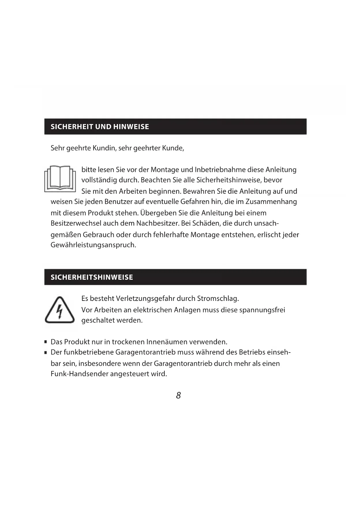 Sehr geehrte Kundin, sehr geehrter Kunde, bitte lesen Sie vor der Montage und Inbetriebnahme diese Anleitung vollständig durch Beachten Sie alle Sicherheitshinweise, bevor Sie mit den Arbeiten beginnen Bewahren Sie die Anleitung auf und weisen Sie jeden Benutzer auf eventuelle Gefahren hin, die im Zusammenhang mit diesem Produkt stehen Übergeben Sie die Anleitung bei einem Besitzerwechsel auch dem Nachbesitzer Bei Schäden, die durch unsach- gemäßen Gebrauch oder durch fehlerhafte Montage entstehen, erlischt jeder Gewährleistungsanspruch SICHERHEITSHINWEISE Es besteht Verletzungsgefahr durch Stromschlag Vor Arbeiten an elektrischen Anlagen muss diese spannungsfrei geschaltet werden Das Produkt nur in trockenen Innenäumen verwenden Der funkbetriebene Garagentorantrieb muss während des Betriebs einseh- bar sein, insbesondere wenn der Garagentorantrieb durch mehr als einen Funk-Handsender angesteuert wird