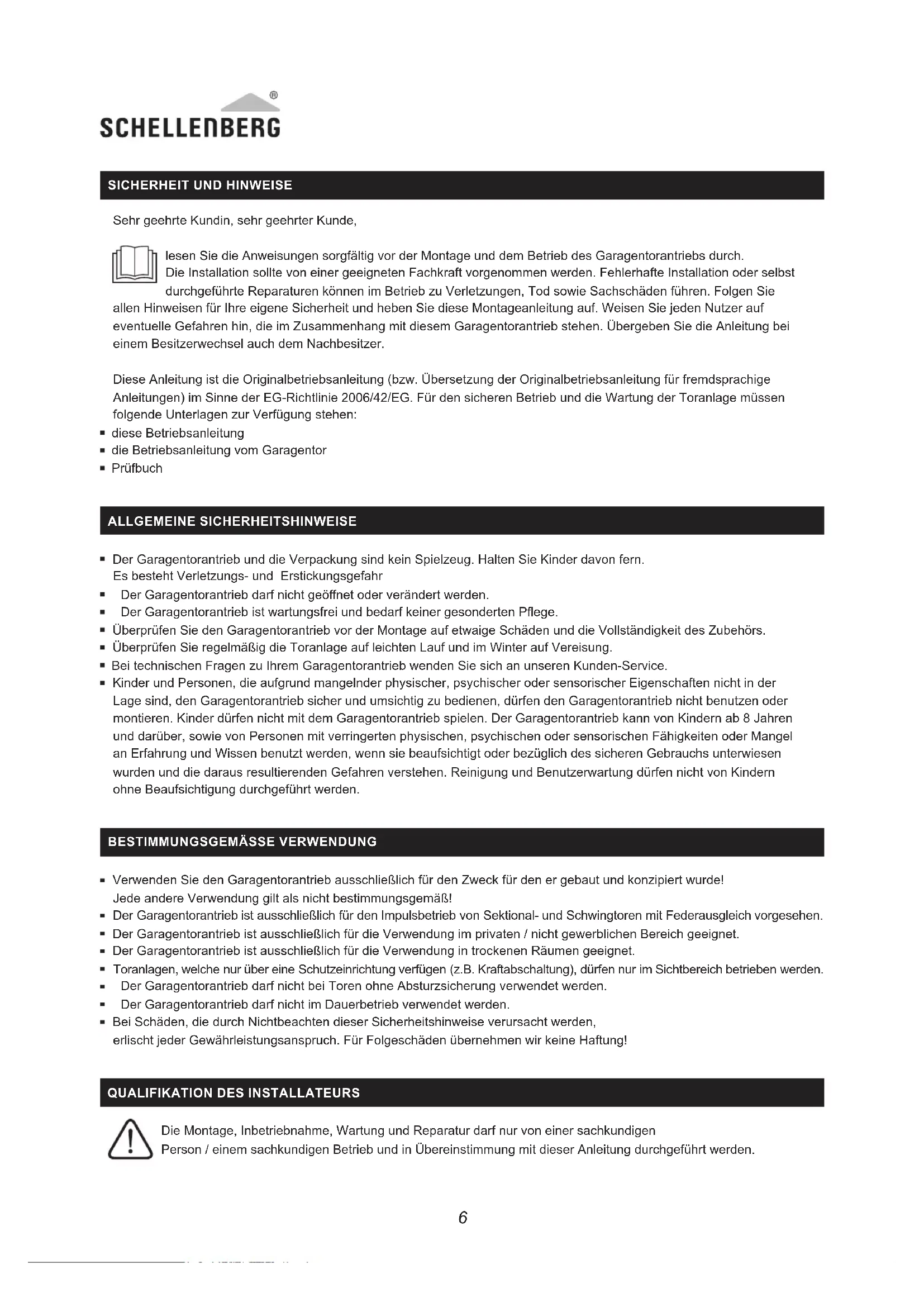 Verwenden Sie den Garagentorantrieb ausschließlich für den Zweck für den er gebaut und konzipiert wurde! Jede andere Verwendung gilt als nicht bestimmungsgemäß! Der Garagentorantrieb ist ausschließlich für den Impulsbetrieb von Sektional- und Schwingtoren mit Federausgleich vorgesehen. Der Garagentorantrieb ist ausschließlich für die Verwendung im privaten / nicht gewerblichen Bereich geeignet. Der Garagentorantrieb ist ausschließlich für die Verwendung in trockenen Räumen geeignet. Toranlagen, welche nur über eine Schutzeinrichtung verfügen (z.B. Kraftabschaltung), dürfen nur im Sichtbereich betrieben werden. Der Garagentorantrieb darf nicht bei Toren ohne Absturzsicherung verwendet werden Der Garagentorantrieb darf nicht im Dauerbetrieb verwendet werden Bei Schäden, die durch Nichtbeachten dieser Sicherheitshinweise verursacht werden, erlischt jeder Gewährleistungsanspruch. Für Folgeschäden übernehmen wir keine Haftung!