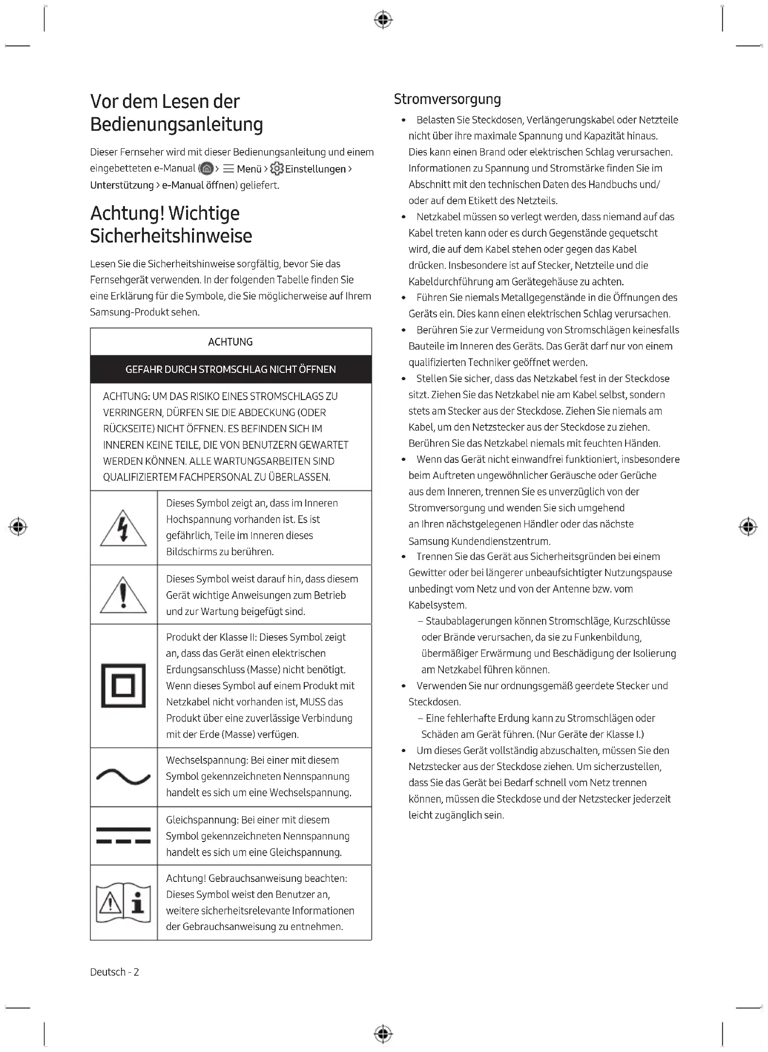 - Para a sua segurança, não tente remover a bateria. Se a bateria não for removida corretamente, poderá danificá- la e ao dispositivo, causar ferimentos em si e/ou tornar o dispositivo pouco seguro. Português - 9 PortuguêsVor dem Lesen der Bedienungsanleitung Dieser Fernseher wird mit dieser Bedienungsanleitung und einem eingebetteten e-Manual ( > Menü > Einstellungen > Unterstützung > e-Manual öffnen) geliefert. Achtung! Wichtige Sicherheitshinweise Lesen Sie die Sicherheitshinweise sorgfältig, bevor Sie das Fernsehgerät verwenden. In der folgenden Tabelle finden Sie eine Erklärung für die Symbole, die Sie möglicherweise auf Ihrem Samsung-Produkt sehen. ACHTUNG