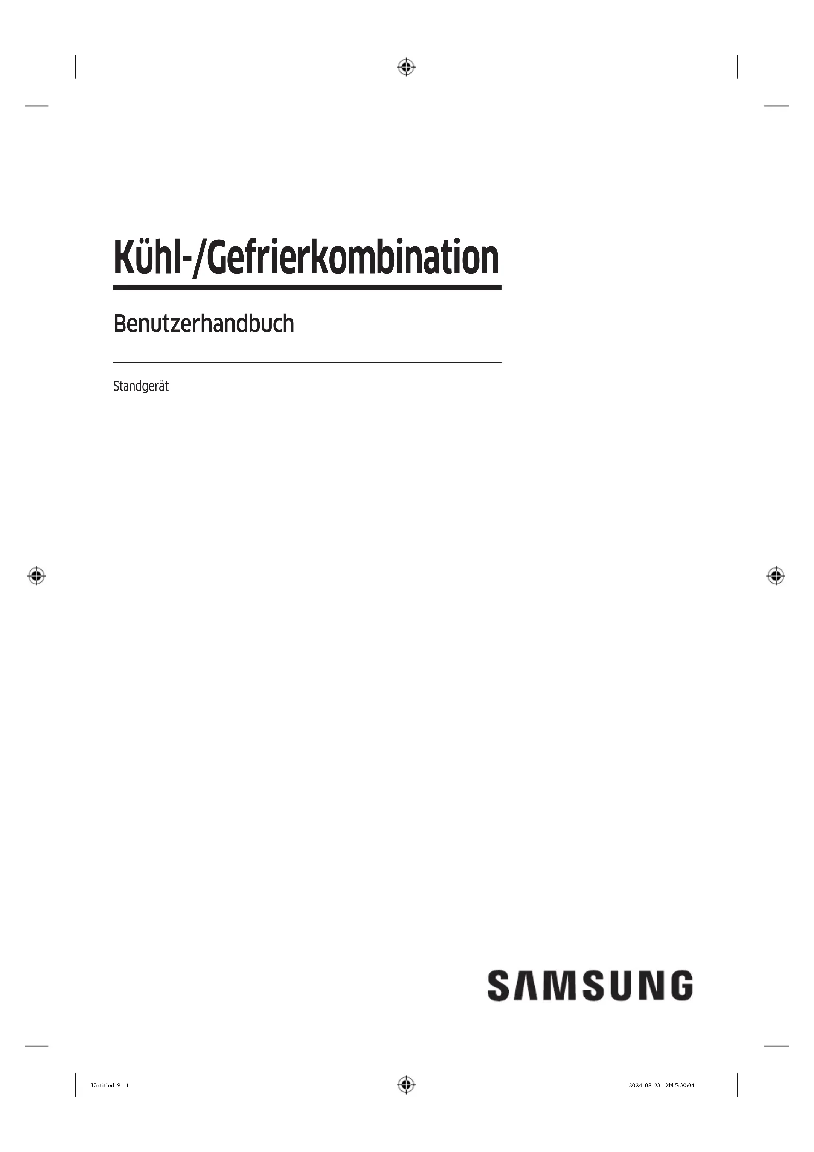 Kühl-/Gefrierkombination Benutzerhandbuch Standgerät Untitled-9 1Untitled-9 1 2024-08-23 5:30:042024-08-23 5:30:04Deutsch2 Inhalt Inhalt Sicherheitsinformationen 4 Wichtige Informationen zu den Sicherheitshinweisen 4 Wichtige Symbole für Sicherheits- und Gefahrenhinweise: 7 Wichtige Vorsichtsmaßnahmen für Ihre Sicherheit 8 Wichtige Warnhinweise für Transport und Aufstellungsort 12 Wichtige Warnhinweise für das Aufstellen 13 Vorsichtshinweise für die Aufstellung 18 Wichtige Warnhinweise für die Verwendung 19 Vorsichtshinweise für die Verwendung 25 Vorsichtshinweise für die Reinigung 28 Wichtige Hinweise für die Entsorgung 31 Weitere Tipps zur ordnungsgemäßen Verwendung 32 Hinweise zur WEEE-Kennzeichnung 34 Installation 35 Ihre Kühl-/Gefrierkombination auf einen Blick 36 Aufstellungshinweise in Verfahrensschritten 40 Bedienung 59 Bedienfeld 59 Einstellung der gewünschten Temperatur oder Funktion 61 Aktivieren bzw. Deaktivieren von AutoFill-Krug (nur für entsprechend ausgestattete Modelle) 62 Ein-/Ausschalten der Eismaschine (nur für entsprechend ausgestattete Modelle) 62 Zurücksetzen oder Verwerfen des Filtertauschalarms (nur für entsprechend ausgestattete Modelle) 62 Ändern der Temperaturskala (nur für entsprechend ausgestattete Modelle) 63 SmartThings 64 Spezialfunktionen 67 Instandhaltung 76 Wartung und Pege 76 Reinigung 80 Ersetzen von Teilen 81 Problembehebung 84 Allgemein 84 Hören Sie ungewöhnliche Geräusche aus dem Kühlschrank? 88 SmartThings 90 Untitled-9 2Untitled-9 2 2024-08-23 5:30:042024-08-23 5:30:04Deutsch 3 Inhalt Anhang 91 Sicherheitshinweise 91 Installationsanleitung 91 Angaben zur Temperaturh 92 Modellinformationen und Bestellung von Ersatzteilen 95 Open Source Announcement 96 Untitled-9 3Untitled-9 3 2024-08-23 5:30:042024-08-23 5:30:04Deutsch4 Sicherheitsinformationen Um sicherzustellen, dass Sie über die Eigenschaften und Funktionen Ihres neuen Geräts Bescheid wissen, müssen Sie diese Anleitung sorgfältig durchlesen, ehe Sie Ihre neue Kühl-/Gefrierkombination von Samsung in Betrieb nehmen. Wichtige Informationen zu den Sicherheitshinweisen