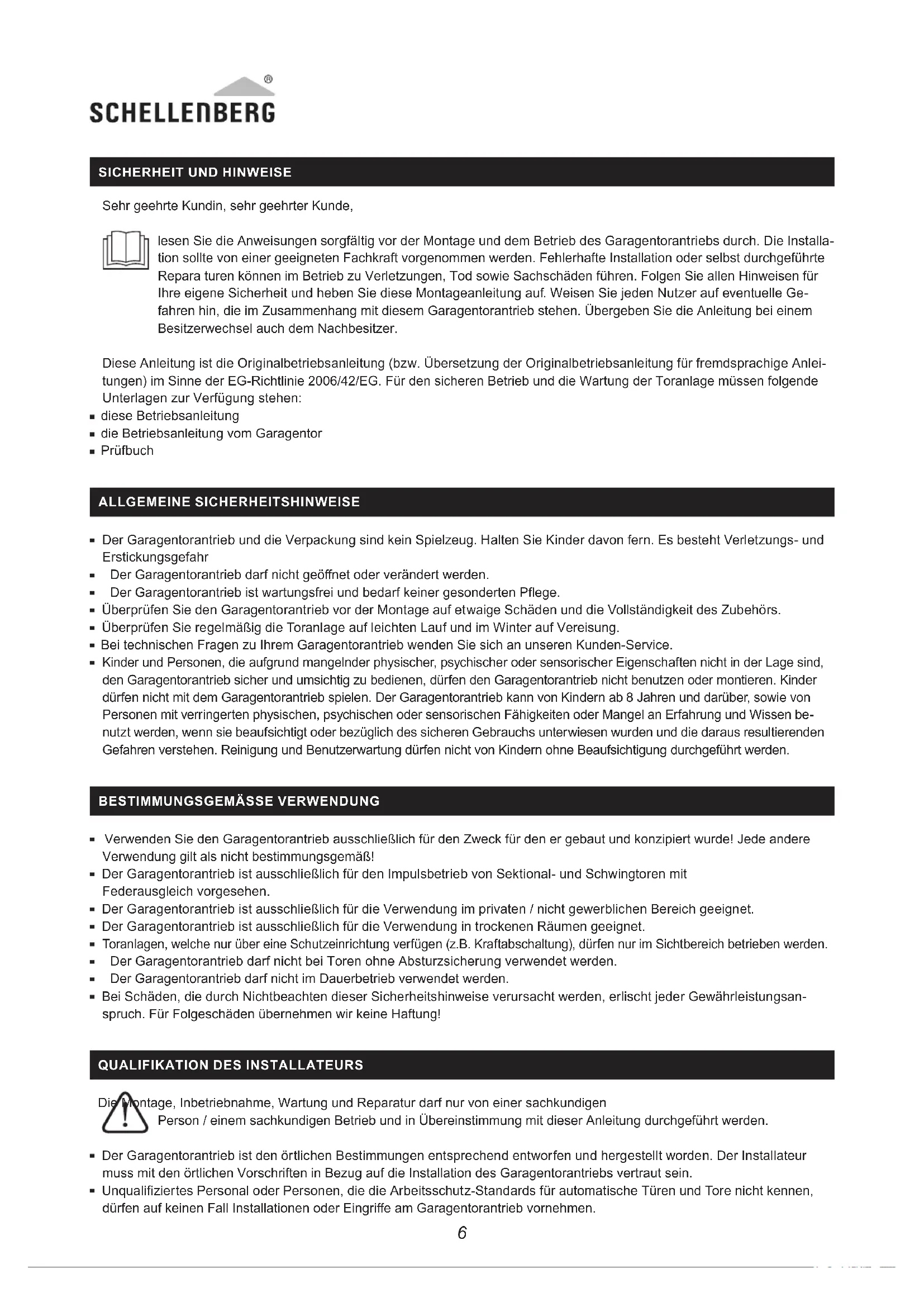Überprüfen Sie Ihren Stromanschluss. Die Werte müssen mit den Werten in dieser Bedienungsanleitung übereinstimmen. Diese Angaben benden sich auch auf dem Typenschild des Garagentorantriebs. Der Stromanschluss in der Garage muss den örtlichen Vorschriften entsprechen. Überprüfen Sie die Sicherheitsfunktionen des Garagentorantriebs wie folgt: Legen Sie einen ca. 50mm hohen Gegenstand (z.B. ein Stück Holz) unter die Hauptschließkante des Garagentores. Lassen Sie das Tor herunterfahren. Beim Auftreen des Tores auf das Hindernis muss der Garagentorantrieb reversieren und den Gegenstand freigeben Benutzen Sie für Ihre zusätzliche Sicherheit eine optionale Lichtschranke (Art.Nr.: 60030/60031) und überprüfen Sie regelmäßig den automatischen Sicherheitsrücklauf. Nach der Lernfahrt muss die Sicherheitseinrichtung (Hinderniserkennung mit Kraftabschaltung, Lichtschranke) überprüft werden8 Die Inbetriebnahme des Endproduktes bzw. der Kombination ist von Seiten der Alfred Schellenberg GmbH so lange untersagt, bis die Konformität des Endproduktes bzw. der Kombination aus dem Garagentorantrieb und Garagentor auf Grundlage der hierfür geltenden Normen, Spezikationen bzw. Richtlinien festgestellt ist. Im Zweifel sollte hierfür ein Montagefachbetrieb eingeschaltet werden
