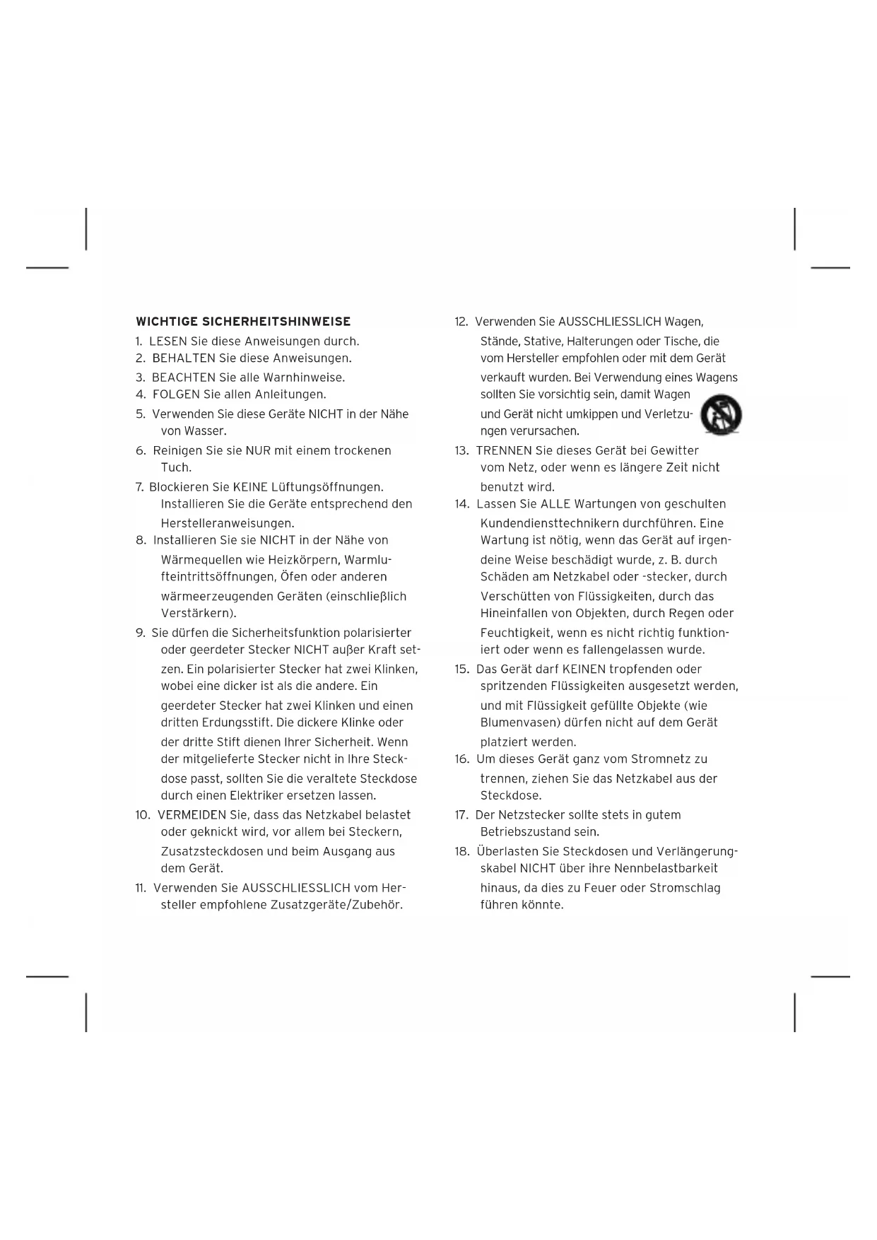 skabel NICHT über ihre Nennbelastbarkeit hinaus, da dies zu Feuer oder Stromschlag führen könnte.Ein Dreieck mit einem Ausrufezeichen in der Mitte soll Benutzer auf wichtige Hinweise zur Bedienung und Wartung des Geräts aufmerksam machen, die in der beiliegen- den Dokumentation enthalten sind. Durch das Blitzsymbol in einem gleich- seitigen Dreieck soll der Benutzer gewarnt werden, dass bei mangelnder Isolierung „lebens- gefährliche Spannungen“ im Gehäuse auftreten können, die eine erhebliche Stromschlaggefahr darstellen. WARNUNG: Um die Gefahr eines Feuers oder Stromschlags zu verringern, ist dieses Gerät vor Regen oder Feuchtigkeit zu schützen. WARNUNG: Auf dem Produkt dürfen keine Flam- menquellen, wie Kerzen, platziert werden.