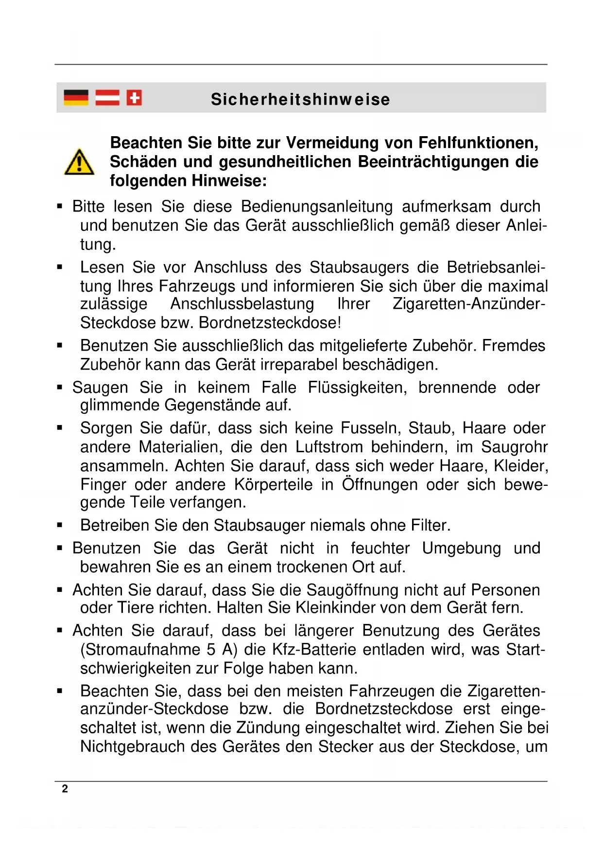 Bitte lesen Sie diese Bedienungsanleitung aufmerksam durch und benutzen Sie das Gerät ausschließlich gemäß dieser Anlei- tung. Lesen Sie vor Anschluss des Staubsaugers die Betriebsanlei- tung Ihres Fahrzeugs und informieren Sie sich über die maximal zulässige Anschlussbelastung Ihrer Zigaretten-Anzünder- Steckdose bzw. Bordnetzsteckdose! Benutzen Sie ausschließlich das mitgelieferte Zubehör. Fremdes Zubehör kann das Gerät irreparabel beschädigen. Saugen Sie in keinem Falle Flüssigkeiten, brennende oder glimmende Gegenstände auf. Sorgen Sie dafür, dass sich keine Fusseln, Staub, Haare oder andere Materialien, die den Luftstrom behindern, im Saugrohr ansammeln. Achten Sie darauf, dass sich weder Haare, Kleider, Finger oder andere Körperteile in Öffnungen oder sich bewe- gende Teile verfangen. Betreiben Sie den Staubsauger niemals ohne Filter. Benutzen Sie das Gerät nicht in feuchter Umgebung und bewahren Sie es an einem trockenen Ort auf. Achten Sie darauf, dass Sie die Saugöffnung nicht auf Personen oder Tiere richten. Halten Sie Kleinkinder von dem Gerät fern. Achten Sie darauf, dass bei längerer Benutzung des Gerätes (Stromaufnahme 5 A) die Kfz-Batterie entladen wird, was Start- schwierigkeiten zur Folge haben kann. Beachten Sie, dass bei den meisten Fahrzeugen die Zigaretten- anzünder-Steckdose bzw. die Bordnetzsteckdose erst einge- schaltet ist, wenn die Zündung eingeschaltet wird. Ziehen Sie bei Nichtgebrauch des Gerätes den Stecker aus der Steckdose, um Beachten Sie bitte zur Vermeidung von Fehlfunktionen, Schäden und gesundheitlichen Beeinträchtigungen die folgenden Hinweise:Sicherheitshinweise