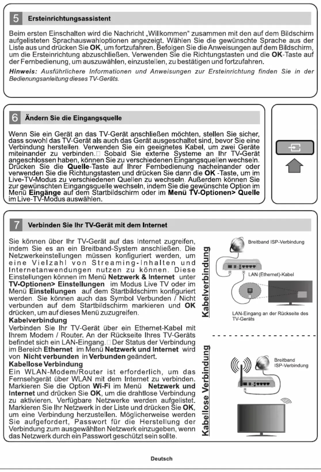 Gerät der Laserklasse 1: Dieses Gerät enthält eine Laserquelle der Klasse 1, die unter vernünftigerweise vor- hersehbaren Betriebsbedin- gungen ungefährlich ist. WARNUNG Batterien dürfen nicht verschluckt werden, es besteht chemische Verätzungsgefahr. Dieses Gerät bzw. das zum Gerät mitgelieferte Zube- hör enthält möglicherweise eine Knopfzellenbatterie. Wenn die Knopfzellenbatterie verschluckt wird, führt dies innerhalb 2 Stunden zu schweren internen Ver- ätzungen mit möglicher Todesfolge. Halten Sie gebrauchte und neue Batterien von Kin- dern fern. Wenn das Batteriefach nicht sicher geschlossen ist, stoppen Sie die Verwendung des Geräts und halten Sie Kinder fern. Falls Sie den Verdacht haben, dass Batterien ver- schluckt wurden oder in irgendeinen Körperteil platziert wurde, suchen Sie sofort medizinische Hilfe auf. – – – – – – – – – – – – Ein TV-Gerät kann umfallen und dabei ernste Ver- letzungen mit möglicher Todesfolge verursachen. Viele Verletzungen, insbesondere bei Kindern, können vermieden werden, wenn die folgenden einfachen Vorsichtsmaßnahmengetroenwerden: