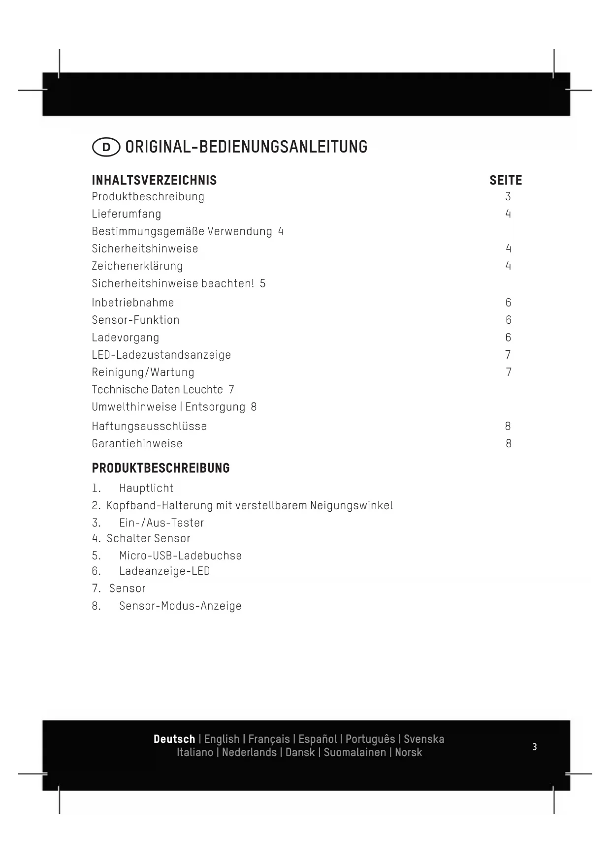 Produktbeschreibung 3 Lieferumfang 4 Bestimmungsgemäße Verwendung 4 Sicherheitshinweise 4 Zeichenerklärung 4 Sicherheitshinweise beachten! 5 Inbetriebnahme 6 Sensor-Funktion 6 Ladevorgang 6 LED-Ladezustandsanzeige 7 Reinigung/Wartung 7 Technische Daten Leuchte 7 Umwelthinweise | Entsorgung 8 Haftungsausschlüsse 8 Garantiehinweise 8 Deutsch | English | Français | Español | Português | Svenska Italiano | Nederlands | Dansk | Suomalainen | Norsk4 LIEFERUMFANG