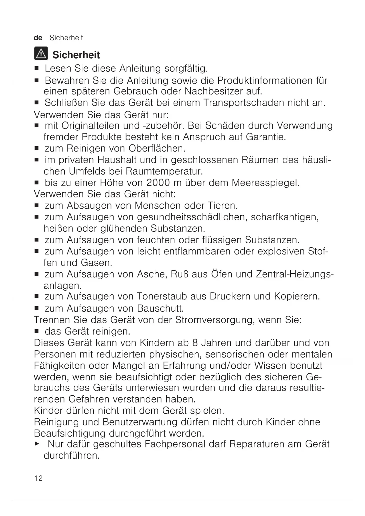 Sicherheit ¡ Lesen Sie diese Anleitung sorgfältig. ¡ Bewahren Sie die Anleitung sowie die Produktinformationen für einen späteren Gebrauch oder Nachbesitzer auf. ¡ Schließen Sie das Gerät bei einem Transportschaden nicht an. Verwenden Sie das Gerät nur: ¡ mit Originalteilen und -zubehör. Bei Schäden durch Verwendung fremder Produkte besteht kein Anspruch auf Garantie. ¡ zum Reinigen von Oberflächen. ¡ im privaten Haushalt und in geschlossenen Räumen des häusli- chen Umfelds bei Raumtemperatur. ¡ bis zu einer Höhe von 2000m über dem Meeresspiegel. Verwenden Sie das Gerät nicht: ¡ zum Absaugen von Menschen oder Tieren. ¡ zum Aufsaugen von gesundheitsschädlichen, scharfkantigen, heißen oder glühenden Substanzen. ¡ zum Aufsaugen von feuchten oder flüssigen Substanzen. ¡ zum Aufsaugen von leicht entflammbaren oder explosiven Stof- fen und Gasen. ¡ zum Aufsaugen von Asche, Ruß aus Öfen und Zentral-Heizungs- anlagen. ¡ zum Aufsaugen von Tonerstaub aus Druckern und Kopierern. ¡ zum Aufsaugen von Bauschutt. Trennen Sie das Gerät von der Stromversorgung, wenn Sie: ¡ das Gerät reinigen. Dieses Gerät kann von Kindern ab 8 Jahren und darüber und von Personen mit reduzierten physischen, sensorischen oder mentalen Fähigkeiten oder Mangel an Erfahrung und/oder Wissen benutzt werden, wenn sie beaufsichtigt oder bezüglich des sicheren Ge- brauchs des Geräts unterwiesen wurden und die daraus resultie- renden Gefahren verstanden haben. Kinder dürfen nicht mit dem Gerät spielen. Reinigung und Benutzerwartung dürfen nicht durch Kinder ohne Beaufsichtigung durchgeführt werden. ▶ Nur dafür geschultes Fachpersonal darf Reparaturen am Gerät durchführen.Sicherheit de
