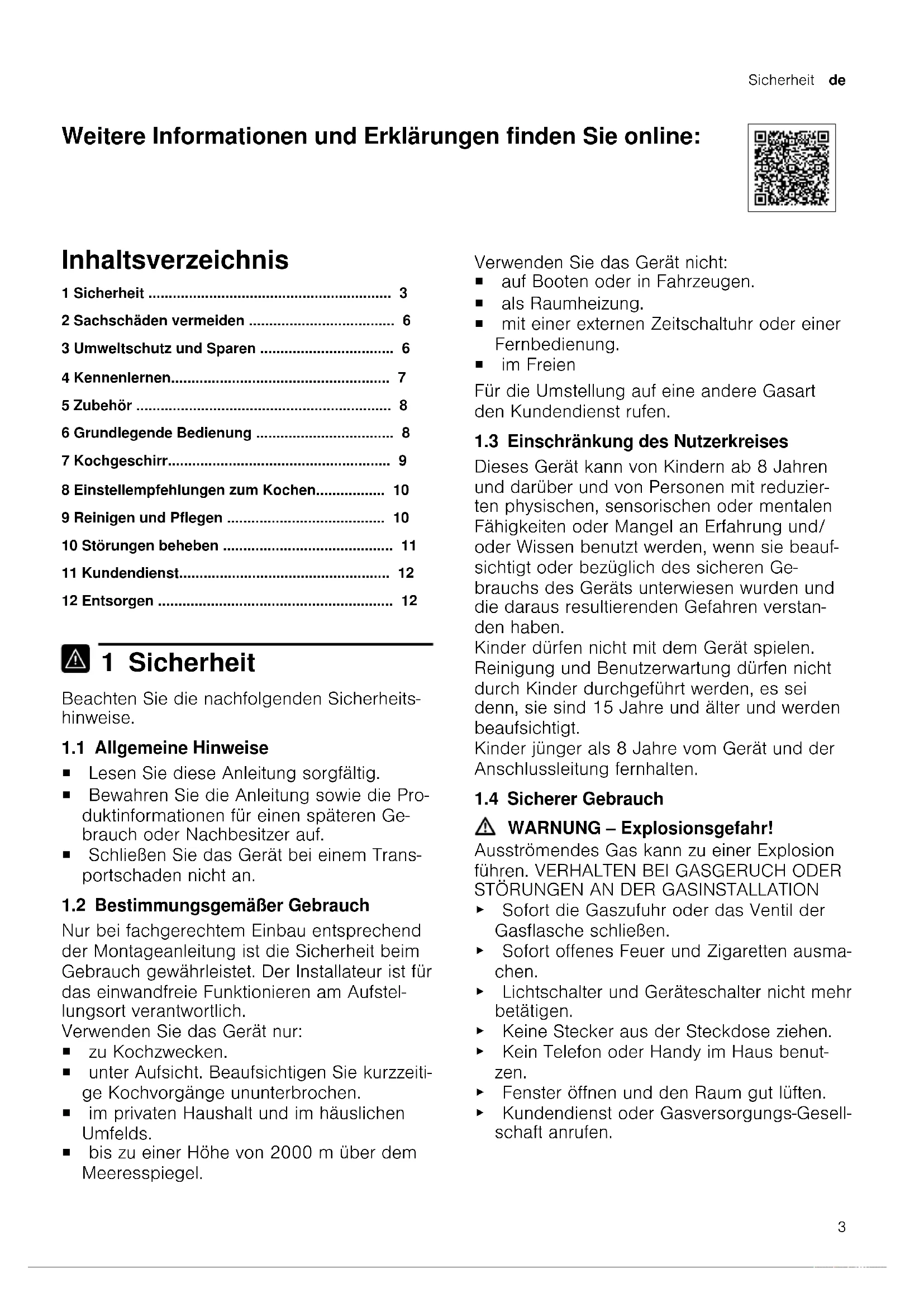 - 12 Entsorgen 1 Sicherheit Beachten Sie die nachfolgenden Sicherheits- hinweise. 1.1 Allgemeine Hinweise ¡ Lesen Sie diese Anleitung sorgfältig. ¡ Bewahren Sie die Anleitung sowie die Pro- duktinformationen für einen späteren Ge- brauch oder Nachbesitzer auf. ¡ Schließen Sie das Gerät bei einem Trans- portschaden nicht an. 1.2 Bestimmungsgemäßer Gebrauch Nur bei fachgerechtem Einbau entsprechend der Montageanleitung ist die Sicherheit beim Gebrauch gewährleistet. Der Installateur ist für das einwandfreie Funktionieren am Aufstel- lungsort verantwortlich. Verwenden Sie das Gerät nur: ¡ zu Kochzwecken. ¡ unter Aufsicht. Beaufsichtigen Sie kurzzeiti- ge Kochvorgänge ununterbrochen. ¡ im privaten Haushalt und im häuslichen Umfelds. ¡ bis zu einer Höhe von 2000m über dem Meeresspiegel. Verwenden Sie das Gerät nicht: ¡ auf Booten oder in Fahrzeugen. ¡ als Raumheizung. ¡ mit einer externen Zeitschaltuhr oder einer Fernbedienung. ¡ im Freien Für die Umstellung auf eine andere Gasart den Kundendienst rufen. 1.3 Einschränkung des Nutzerkreises Dieses Gerät kann von Kindern ab 8 Jahren und darüber und von Personen mit reduzier- ten physischen, sensorischen oder mentalen Fähigkeiten oder Mangel an Erfahrung und/ oder Wissen benutzt werden, wenn sie beauf- sichtigt oder bezüglich des sicheren Ge- brauchs des Geräts unterwiesen wurden und die daraus resultierenden Gefahren verstan- den haben. Kinder dürfen nicht mit dem Gerät spielen. Reinigung und Benutzerwartung dürfen nicht durch Kinder durchgeführt werden, es sei denn, sie sind 15 Jahre und älter und werden beaufsichtigt. Kinder jünger als 8 Jahre vom Gerät und der Anschlussleitung fernhalten. 1.4 Sicherer Gebrauch WARNUNG‒Explosionsgefahr! Ausströmendes Gas kann zu einer Explosion führen. VERHALTEN BEI GASGERUCH ODER p. 12