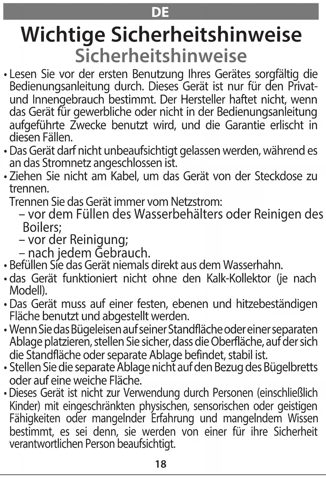 - Ihr Gerät erzeugt Dampf, der Verbrennungen verursachen kann. – Seien Sie im Umgang mit dem Bügeleisen vorsichtig, vor allem beim vertikalen Bügeln. – Bügeln Sie ein Kleidungsstück niemals an einer Person, sondern nur an einem Bügel hängend. – Bügeln Sie niemals im Sitzen mit den Beinen unter dem Bügelbrett. – Richten Sie den Dampf niemals auf Personen oder Tiere.
