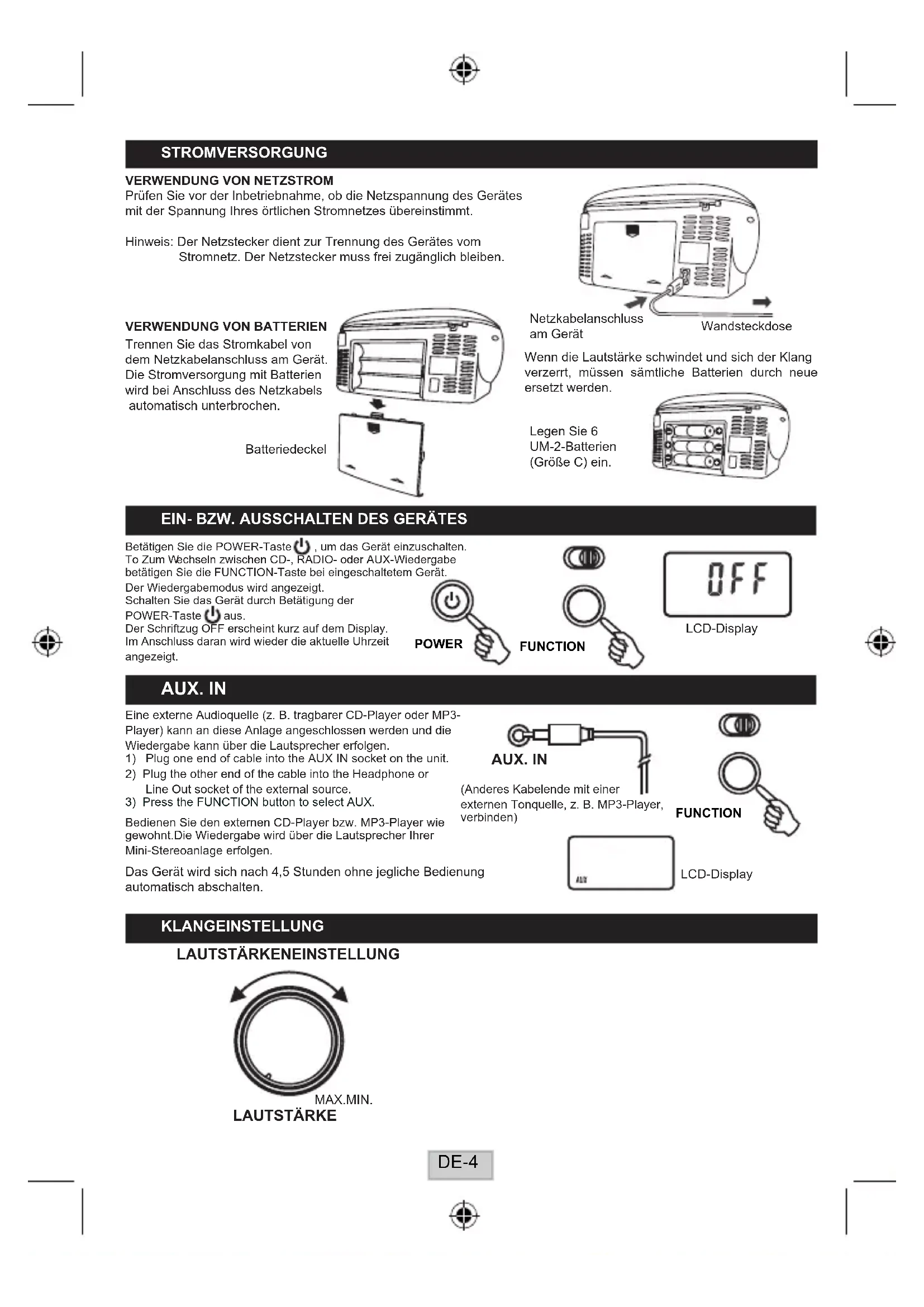 DE-3Betätigen Sie die POWER-Taste , um das Gerät einzuschalten. To Zum W echseln zwischen CD-, RADIO- oder AUX-Wiedergabe betätigen Sie die FUNCTION-Taste bei eingeschaltetem Gerät. Der Wiedergabemodus wird angezeigt. Schalten Sie das Gerät durch Betätigung der POWER-Taste aus. Der Schriftzug OFF erscheint kurz auf dem Display. Im Anschluss daran wird wieder die aktuelle Uhrzeit angezeigt.