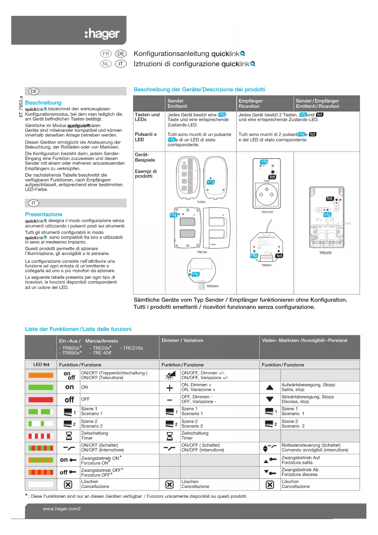 LED fct Funktion / Funzione Funktion / Funzione Funktion / Funzione ON/OFF (Treppenlichtschaltung )ON/OFF (Teleruttore)ON/OFF, Dimmen +/-ON/OFF, Variazione +/- ON, Dimmen +ON, Variazione +Aufwärtsbewegung, StoppSalita, stop OFF OFF, Dimmen -OFF, Variazione -Abwärtsbewegung, StoppDiscesa, stopSzene 1Scenario 1Szene 1Scenario 1Szene 1 Scenario 1 Szene 2Scenario 2Szene 2 Scenario 2 Szene 2Scenario 2 ZeitschaltungTimerZeitschaltungTimerON/OFF (Schalter)ON/OFF (Interruttore)ON/OFF ( Schalter)ON/OFF (Interruttore)Rollladensteuerung (Schalter)Comando avvolgibili (interruttore)Zwangsbetrieb ON Forzatura ON Zwangsbetrieb AufForzatura salita Zwangsbetrieb OFF Forzatura OFF Zwangsbetrieb Ab Forzatura discesaLöschenCancellazioneLöschenCancellazioneLöschenCancellazione Beschreibung bezeichnet den werkzeuglosenKonfigurationsmodus, bei dem man lediglich dieam Gerät befindlichen Tasten betätigt.Sämtliche im Modus konfigurierbarenGeräte sind miteinander kompatibel und könneninnerhalb derselben Anlage betrieben werden.Diesen Geräten ermöglicht die Ansteuerung derBeleuchtung, der Rollläden oder von Markisen.Die Konfiguration besteht darin, jedem Sender-Eingang eine Funktion zuzuweisen und diesenSender mit einem oder mehreren anzusteuerndenEmpfängern zu verknüpfen.Die nachstehende Tabelle beschreibt die verfügbaren Funktionen, nach Empfängern aufgeschlüsselt, entsprechend einer bestimmtenLED-Farbe. quicklink quicklink