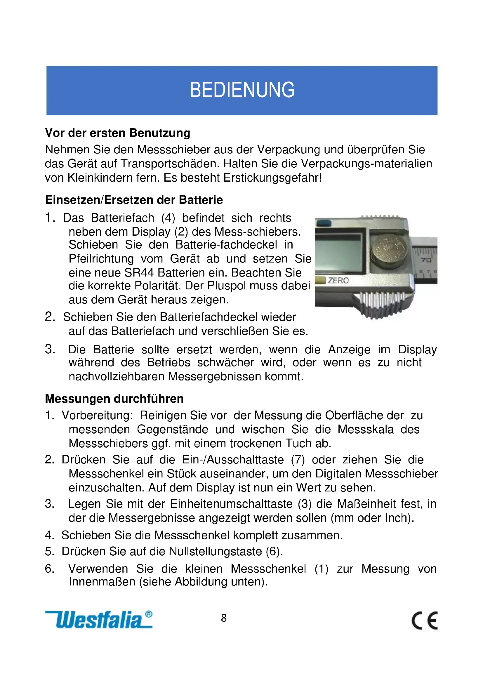 Vor der ersten Benutzung Nehmen Sie den Messschieber aus der Verpackung und überprüfen Sie das Gerät auf Transportschäden. Halten Sie die Verpackungs-materialien von Kleinkindern fern. Es besteht Erstickungsgefahr! Einsetzen/Ersetzen der Batterie