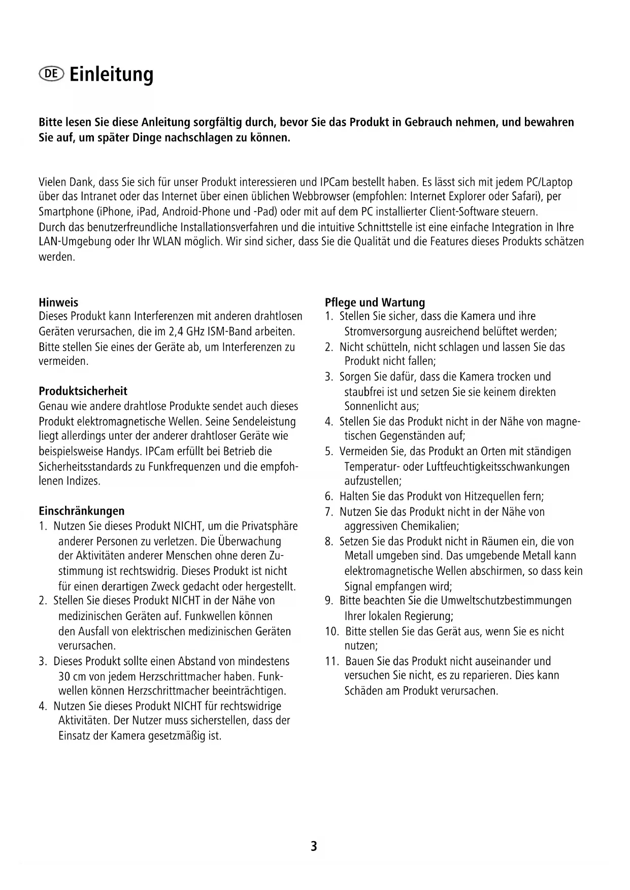 Einleitung Bitte lesen Sie diese Anleitung sorgfältig durch, bevor Sie das Produkt in Gebrauch nehmen, und bewahren Sie auf, um später Dinge nachschlagen zu können. Vielen Dank, dass Sie sich für unser Produkt interessieren und IPCam bestellt haben. Es lässt sich mit jedem PC/Laptop über das Intranet oder das Internet über einen üblichen Webbrowser (empfohlen: Internet Explorer oder Safari), per Smartphone (iPhone, iPad, Android-Phone und -Pad) oder mit auf dem PC installierter Client-Software steuern. Durch das benutzerfreundliche Installationsverfahren und die intuitive Schnittstelle ist eine einfache Integration in Ihre LAN-Umgebung oder Ihr WLAN möglich. Wir sind sicher, dass Sie die Qualität und die Features dieses Produkts schätzen werden. Hinweis Dieses Produkt kann Interferenzen mit anderen drahtlosen Geräten verursachen, die im 2,4 GHz ISM-Band arbeiten. Bitte stellen Sie eines der Geräte ab, um Interferenzen zu vermeiden. Produktsicherheit Genau wie andere drahtlose Produkte sendet auch dieses Produkt elektromagnetische Wellen. Seine Sendeleistung liegt allerdings unter der anderer drahtloser Geräte wie beispielsweise Handys. IPCam erfüllt bei Betrieb die Sicherheitsstandards zu Funkfrequenzen und die empfoh- lenen Indizes. Einschränkungen