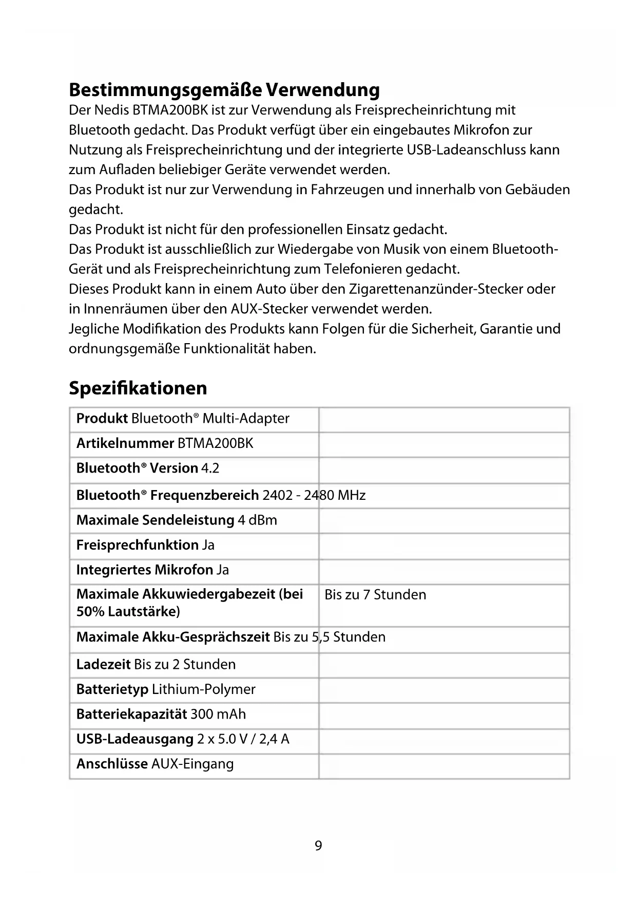 Kurzanleitung Bluetooth® Multi-Adapter BTMA200BK Weitere Informationen finden Sie in der erweiterten Anleitung online: ned.is/btma200bk9 Bestimmungsgemäße Verwendung Der Nedis BTMA200BK ist zur Verwendung als Freisprecheinrichtung mit Bluetooth gedacht. Das Produkt verfügt über ein eingebautes Mikrofon zur Nutzung als Freisprecheinrichtung und der integrierte USB-Ladeanschluss kann zum Aufladen beliebiger Geräte verwendet werden. Das Produkt ist nur zur Verwendung in Fahrzeugen und innerhalb von Gebäuden gedacht. Das Produkt ist nicht für den professionellen Einsatz gedacht. Das Produkt ist ausschließlich zur Wiedergabe von Musik von einem Bluetooth- Gerät und als Freisprecheinrichtung zum Telefonieren gedacht. Dieses Produkt kann in einem Auto über den Zigarettenanzünder-Stecker oder in Innenräumen über den AUX-Stecker verwendet werden. Jegliche Modifikation des Produkts kann Folgen für die Sicherheit, Garantie und ordnungsgemäße Funktionalität haben. Spezikationen Produkt Bluetooth® Multi-Adapter Artikelnummer BTMA200BK Bluetooth® Version 4.2 Bluetooth® Frequenzbereich 2402 - 2480 MHz Maximale Sendeleistung 4 dBm Freisprechfunktion Ja Integriertes Mikrofon Ja Maximale Akkuwiedergabezeit (bei 50% Lautstärke) Bis zu 7 Stunden Maximale Akku-Gesprächszeit Bis zu 5,5 Stunden Ladezeit Bis zu 2 Stunden Batterietyp Lithium-Polymer Batteriekapazität 300 mAh USB-Ladeausgang 2 x 5.0 V / 2,4 A Anschlüsse AUX-Eingang10 Hauptbestandteile (Abbildung A)