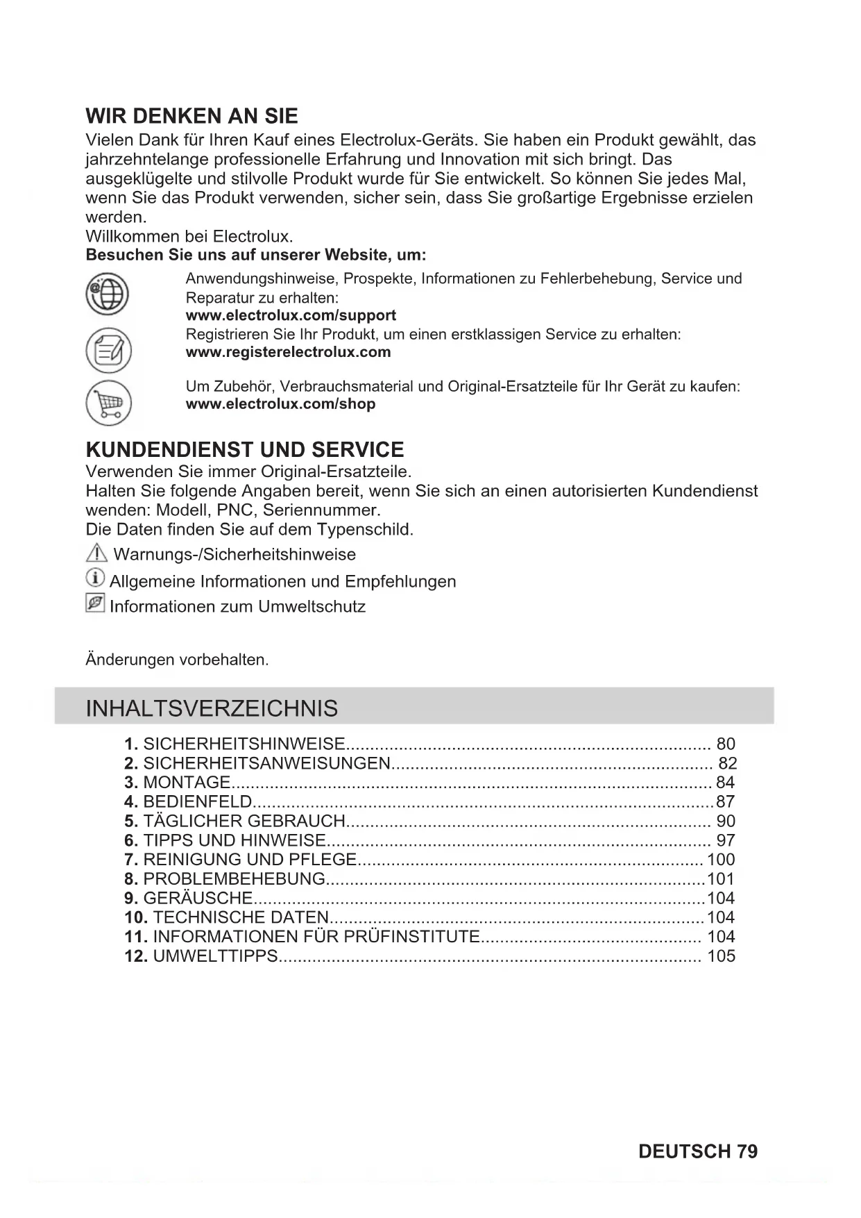 Vielen Dank für Ihren Kauf eines Electrolux-Geräts. Sie haben ein Produkt gewählt, das jahrzehntelange professionelle Erfahrung und Innovation mit sich bringt. Das ausgeklügelte und stilvolle Produkt wurde für Sie entwickelt. So können Sie jedes Mal, wenn Sie das Produkt verwenden, sicher sein, dass Sie großartige Ergebnisse erzielen werden. Willkommen bei Electrolux. Besuchen Sie uns auf unserer Website, um: Anwendungshinweise, Prospekte, Informationen zu Fehlerbehebung, Service undReparatur zu erhalten:www.electrolux.com/supportRegistrieren Sie Ihr Produkt, um einen erstklassigen Service zu erhalten:www.registerelectrolux.comUm Zubehör, Verbrauchsmaterial und Original-Ersatzteile für Ihr Gerät zu kaufen:www.electrolux.com/shop
