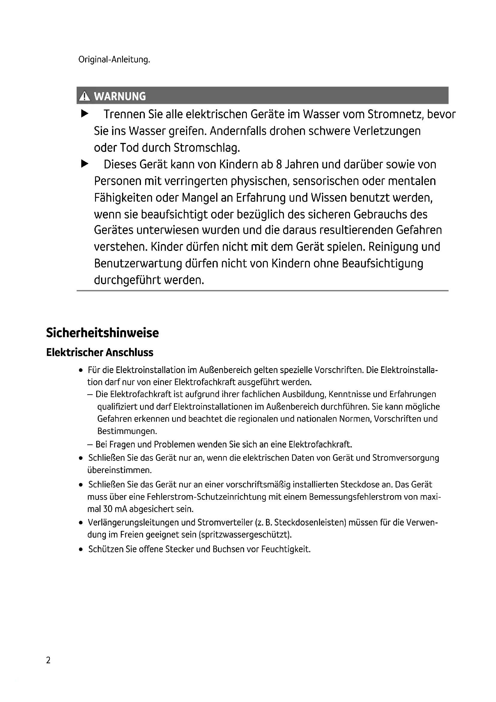 WARNUNG WARNUNG Trennen Sie alle elektrischen Geräte im Wasser vom Stromnetz, bevor Sie ins Wasser greifen. Andernfalls drohen schwere Verletzungen oder Tod durch Stromschlag. Dieses Gerät kann von Kindern ab 8 Jahren und darüber sowie von Personen mit verringerten physischen, sensorischen oder mentalen Fähigkeiten oder Mangel an Erfahrung und Wissen benutzt werden, wenn sie beaufsichtigt oder bezüglich des sicheren Gebrauchs des Gerätes unterwiesen wurden und die daraus resultierenden Gefahren verstehen. Kinder dürfen nicht mit dem Gerät spielen. Reinigung und Benutzerwartung dürfen nicht von Kindern ohne Beaufsichtigung durchgeführt werden. Sicherheitshinweise Elektrischer Anschluss Für die Elektroinstallation im Außenbereich gelten spezielle Vorschriften. Die Elektroinstalla- tion darf nur von einer Elektrofachkraft ausgeführt werden. – Die Elektrofachkraft ist aufgrund ihrer fachlichen Ausbildung, Kenntnisse und Erfahrungen qualifiziert und darf Elektroinstallationen im Außenbereich durchführen. Sie kann mögliche Gefahren erkennen und beachtet die regionalen und nationalen Normen, Vorschriften und Bestimmungen. – Bei Fragen und Problemen wenden Sie sich an eine Elektrofachkraft. Schließen Sie das Gerät nur an, wenn die elektrischen Daten von Gerät und Stromversorgung übereinstimmen. Schließen Sie das Gerät nur an einer vorschriftsmäßig installierten Steckdose an. Das Gerät muss über eine Fehlerstrom-Schutzeinrichtung mit einem Bemessungsfehlerstrom von maxi- mal 30 mA abgesichert sein. Verlängerungsleitungen und Stromverteiler (z. B. Steckdosenleisten) müssen für die Verwen- dung im Freien geeignet sein (spritzwassergeschützt). Schützen Sie offene Stecker und Buchsen vor Feuchtigkeit.DE