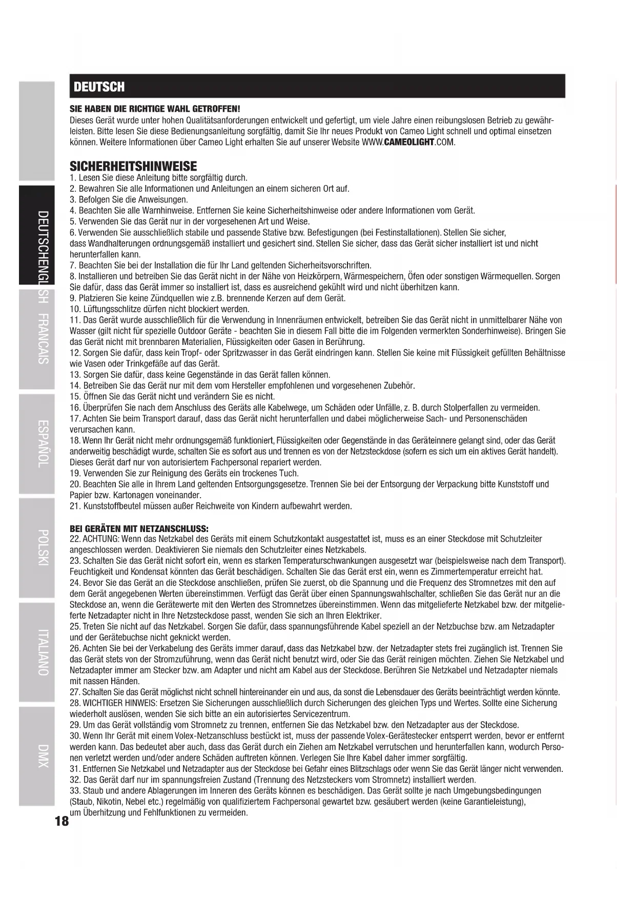 (Gültig in der Europäischen Union und anderen europäischen Ländern mit Mülltrennung) Dieses Symbol auf dem Produkt oder dazugehörigen Dokumenten weist darauf hin, dass das Gerät am Ende der Produktlebenszeit nicht zusammen mit dem normalen Hausmüll entsorgt werden darf, um Umwelt- oder Personenschäden durch unkontrollierte Abfallentsorgung zu vermeiden. Bitte entsorgen Sie dieses Produkt getrennt von anderen Abfällen und führen es zur Förderung nachhaltiger Wirtschaftskreisläufe dem Recycling zu. Als Privatkunde erhalten Sie Informationen zu umweltfreundlichen Entsorgungsmöglichkeiten über den Händler, bei dem das Produkt erworben wurde, oder über die entsprechenden regionalen Behörden. Als gewerblicher Nutzer kontaktieren Sie bitte Ihren Lieferanten und prüfen die ggf. vertraglich vereinbarten Konditionen zur Entsorgung der Geräte. Dieses Produkt darf nicht zusammen mit anderen gewerblichen Abfällen entsorgt werden. CE-Konformität Hiermit erklärt die Adam Hall GmbH, dass dieses Produkt folgenden Richtlinien entspricht (soweit zutreffend): R&TTE (1999/5/EG) bzw. RED (2014/53/EU) ab Juni 2017 Niederspannungsrichtlinie (2014/35/EU) EMV-Richtlinie (2014/30/EU) RoHS (2011/65/EU) Die vollständige Konformitätserklärung finden Sie unter www.adamhall.com. Des Weiteren können Sie diese auch unter info@adamhall.com anfragen.33 DMX DEUTSCHFRANCAIS ESPAÑOL ENGLISH ITALIANO POLSKI FRANCAIS Vous avez fait le bon choix! Cet appareil a été développé et fabriqué en appliquant des exigences de qualité très élevées: il garantit des années de fonctionnement sans problème.Veuillez lire attentivement ce Manuel Utilisateur : vous apprendrez rapidement à utiliser votre appareil Cameo Light de façon optimale. Vous trouverez davantage d‘informations à propos de Cameo Light sur notre site Web: WWW.CAMEOLIGHT.COM.