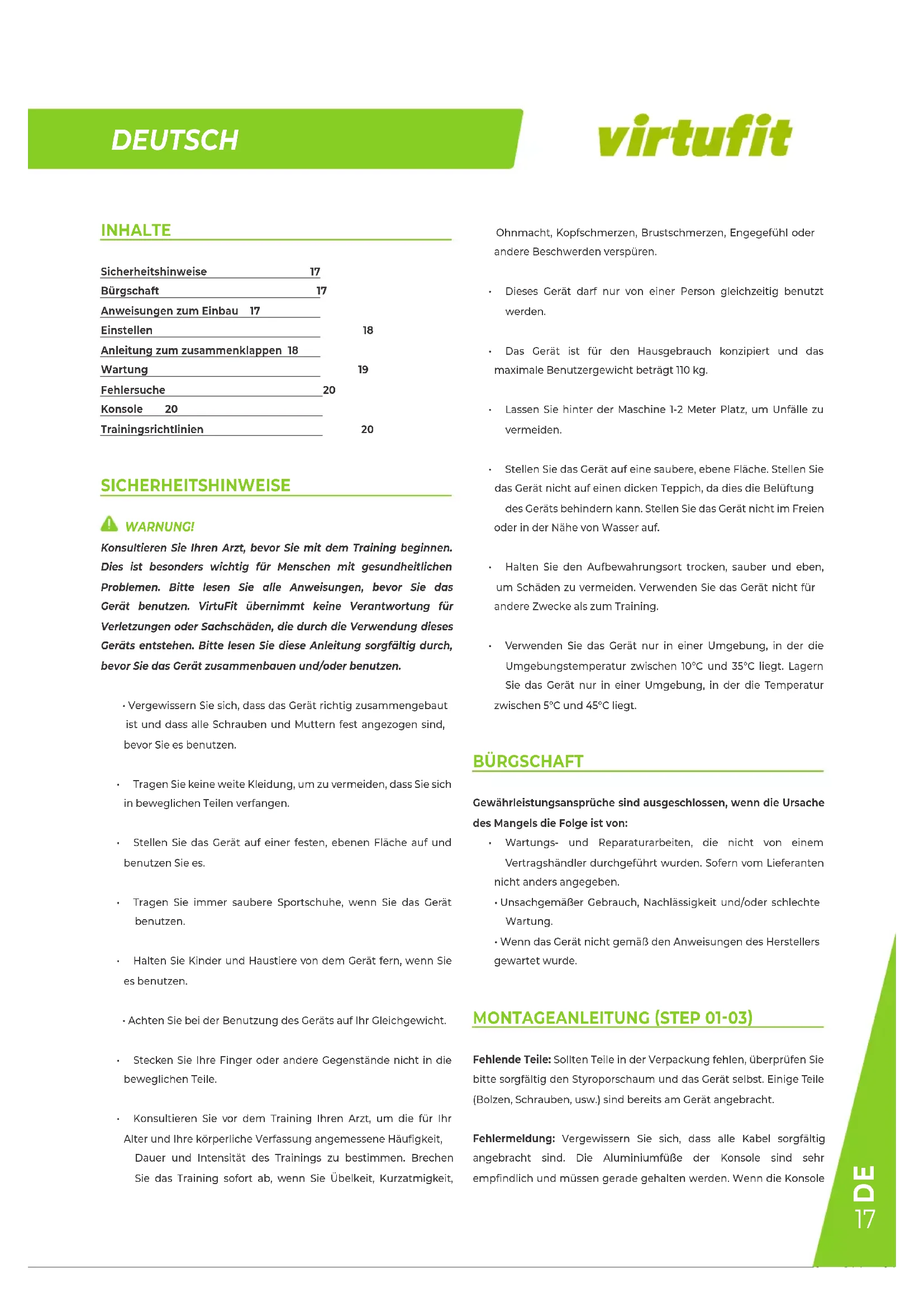 INHALTE Sicherheitshinweise 17 Bürgschaft 17 Anweisungen zum Einbau 17 Einstellen 18 Anleitung zum zusammenklappen 18 Wartung 19 Fehlersuche 20 Konsole 20 Trainingsrichtlinien 20 SICHERHEITSHINWEISE WARNUNG! Konsultieren Sie Ihren Arzt, bevor Sie mit dem Training beginnen. Dies ist besonders wichtig für Menschen mit gesundheitlichen Problemen. Bitte lesen Sie alle Anweisungen, bevor Sie das Gerät benutzen. VirtuFit übernimmt keine Verantwortung für Verletzungen oder Sachschäden, die durch die Verwendung dieses Geräts entstehen. Bitte lesen Sie diese Anleitung sorgfältig durch, bevor Sie das Gerät zusammenbauen und/oder benutzen.