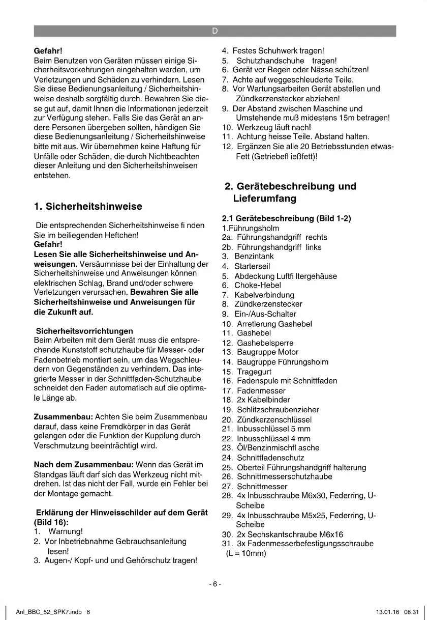 Verwendung Die Motorsense (Verwendung des Schneidmes- sers) eignet sich zum Schneiden von leichten Gehölz, starken Unkraut und Unterholz. Der Motortrimmer (Verwendung der Fadenspule mit Schnittfaden) eignet sich zum Schneiden von Rasen, Grasfl ächen und leichten Unkraut. Die Einhaltung der vom Hersteller beigefügten Gebrauchsanweisung ist Vorraussetzung für den ordnungsgemäßen Gebrauch des Gerätes. Jede andere Verwendung, die in dieser Anleitung nicht ausdrücklich zugelassen wird, kann zu Schäden am Gerät führen und eine ernsthafte Gefahr für den Benutzer darstellen. Beachten Sie unbedingt die Einschränkungen in den Sicherheitshinwei- sen. Bitte beachten Sie, dass unsere Geräte bestim- mungsgemäß nicht für den gewerblichen, hand- werklichen oder industriellen Einsatz konstruiert wurden. Wir übernehmen keine Gewährleistung, wenn das Gerät in Gewerbe-, Handwerks- oder Industriebetrieben sowie bei gleichzusetzenden Tätigkeiten eingesetzt wird. Gefahr! Wegen körperlicher Gefährdung des Benutzers darf die Benzinmotorsense nicht zu folgenden Arbeiten eingesetzt werden: zum Reini- gen von Gehwegen und als Häcksler zum Zerklei- nern von Baum- und Heckenabschnitten. Ferner darf die Benzinmotorsense nicht zum Einebnen von Bodenerhebungen, wie z.B. Maulwurfshügel verwendet werden. Aus Sicherheitsgründen darf die Benzinmotorsense nicht als Antriebsaggregat für andere Arbeitswerkzeuge und Werkzeugsätze jeglicher Art verwendet werden. Die Maschine darf nur nach ihrer Bestimmung verwendet werden. Jede weitere darüber hinaus- gehende Verwendung ist nicht bestimmungsge- mäß. Für daraus hervorgerufene Schäden oder Verletzungen aller Art haftet der Benutzer/Bedie- ner und nicht der Hersteller. Anl_BBC_52_SPK7.indb 7Anl_BBC_52_SPK7.indb 7 13.01.16 08:3113.01.16 08:31D