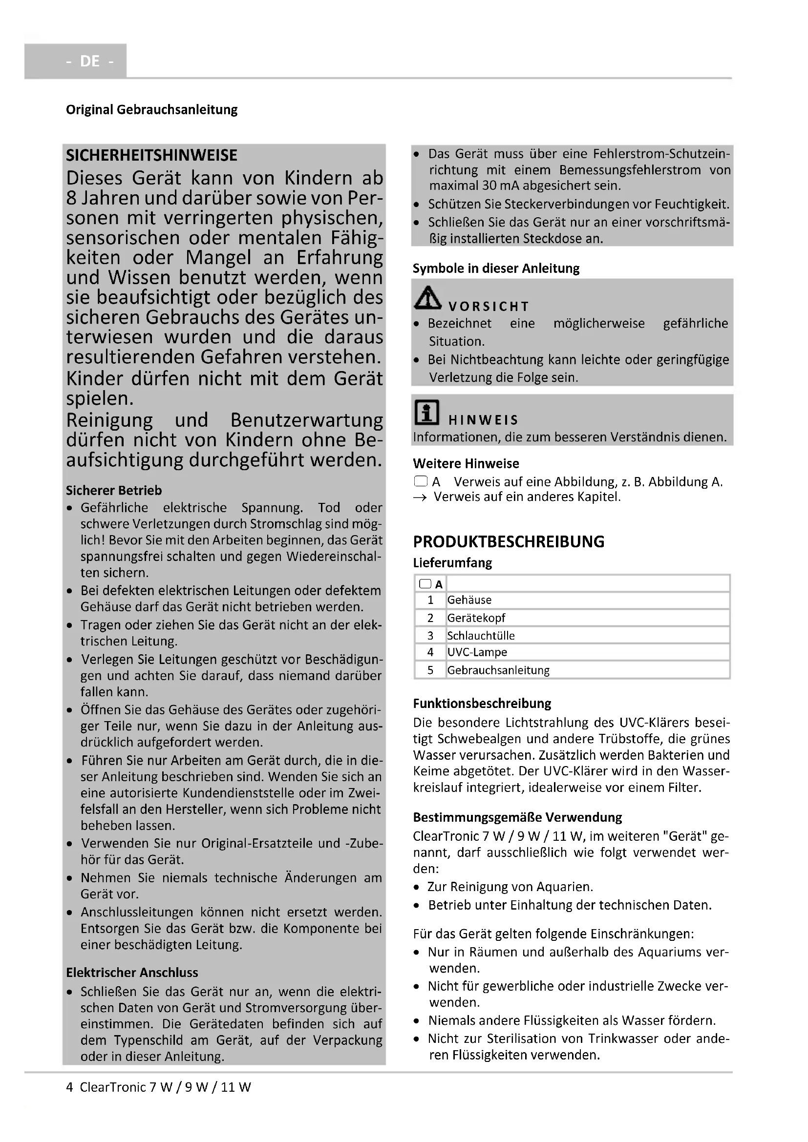 Funktionsbeschreibung Die besondere Lichtstrahlung des UVC-Klärers besei- tigt Schwebealgen und andere Trübstoffe, die grünes Wasser verursachen. Zusätzlich werden Bakterien und Keime abgetötet. Der UVC-Klärer wird in den Wasser- kreislauf integriert, idealerweise vor einem Filter. Bestimmungsgemäße Verwendung ClearTronic 7 W / 9 W / 11 W, im weiteren "Gerät" ge- nannt, darf ausschließlich wie folgt verwendet wer- den: