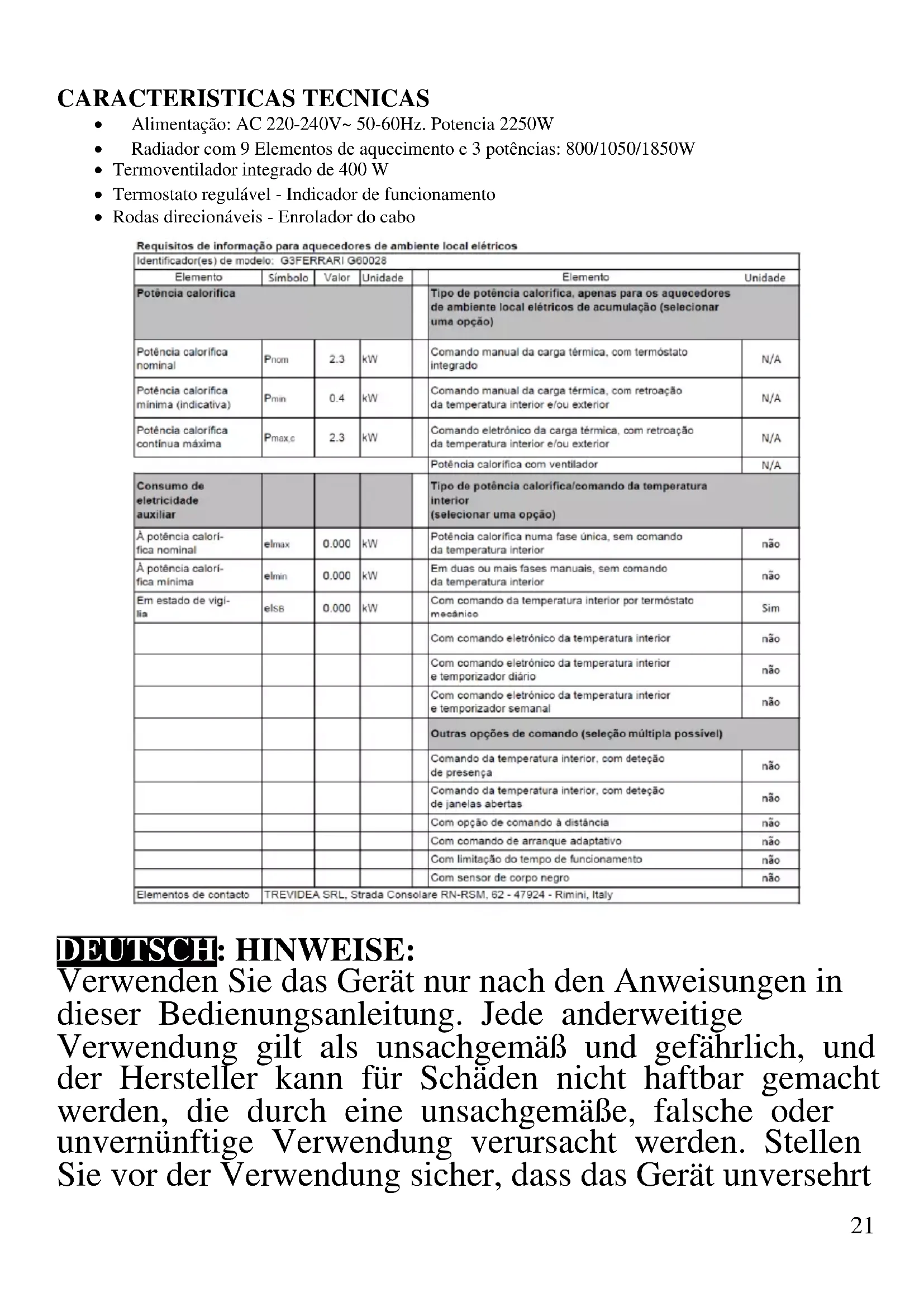 DEUTSCH: HINWEISE: Verwenden Sie das Gerät nur nach den Anweisungen in dieser Bedienungsanleitung. Jede anderweitige Verwendung gilt als unsachgemäß und gefährlich, und der Hersteller kann für Schäden nicht haftbar gemacht werden, die durch eine unsachgemäße, falsche oder unvernünftige Verwendung verursacht werden. Stellen Sie vor der Verwendung sicher, dass das Gerät unversehrt22 ist. Im Zweifelsfall verwenden Sie es nicht und wenden Sie sich an den Kundendienst. Verpackungsmaterial (Plastiktüten, Styropor, Nägel, Klammern) muss für Kinder unzugänglich aufbewahrt werden, da es eine potenzielle Gefahrenquelle darstellt. Wir möchten Sie in diesem Zusammenhang auch daran erinnern, dass Verpackungsabfall der Mülltrennung zugeführt werden muss. Stellen Sie sicher, dass die Angaben auf dem Typenschild mit denen des Stromnetzes übereinstimmen. Die Installation muss gemäß den Anweisungen des Herstellers unter Berücksichtigung der maximal auf dem Typenschild angegeben Leistung erfolgen. Eine unsachgemäße Installation kann zu Verletzungen von Personen, Tieren oder zu Sachschäden führen, für die der Hersteller nicht haftbar gemacht werden kann. Wenn Adapter, Mehrfachsteckdosen und Verlängerungskabel erforderlich sind, verwenden Sie nur solche, die die geltenden Sicherheitsstandards erfüllen. In keinem Fall dürfen die am einfachen Adapter und/oder an den Verlängerungskabeln angegebenen Verbrauchsgrenzen sowie die maximale Leistung überschritten werden, die auf dem Mehrfachadapter angegeben ist. - Verwenden Sie das Netzkabel nicht in der Nähe von scharfen Gegenständen oder heißen Oberflächen und ziehen Sie den Netzstecker nicht am Netzkabel aus der Steckdose. Lassen Sie es nicht von der Arbeitsplatte baumeln, wo ein Kind es halten könnte. Verwenden Sie das Gerät im Falle von Schäden am Netzkabel, Stecker oder im Falle von Kurzschlüssen nicht und lassen Sie es in einer Vertragswerkstatt reparieren. - Setzen Sie das Gerät keinen ungünstigen Wetterbedingungen, wie z. B. Regen, Feuchtigkeit, Frost, aus und bewahren Sie es an einem trockenen Ort23 auf. Fassen Sie das Gerät nicht mit nassen Händen an und verwenden Sie es nicht barfuß. - Dieses Gerät kann von Kindern ab 8 Jahren und von Personen mit eingeschränkten körperlichen, sensorischen oder geistigen Fähigkeiten oder mangelnder Erfahrung und Kenntnissen verwendet werden, wenn sie beaufsichtigt oder instruiert wurden, um das Gerät sicher zu verwenden und die damit verbundenen Gefahren zu verstehen. Kinder dürfen nicht mit dem Gerät spielen. Reinigung und Benutzerwartung dürfen nicht von Kindern ohne Aufsicht durchgeführt werden. - Kinder dürfen nicht mit dem Gerät spielen. - Bewahren Sie das Gerät und sein Netzanschluss außerhalb der Reichweite von Kinder unter 8 Jahren. Wenn das Netzkabel beschädigt ist oder wenn ein Fehler vorliegt, darf das Gerät nicht manipuliert werden. Jede Reparatur muss vom Hersteller oder seinem technischen Kundendienst oder in jedem Fall von einer Person mit ähnlicher Qualifikation durchgeführt werden, um jegliches Risiko zu vermeiden. Die Nichtbeachtung der vorstehenden Bestimmungen kann die Sicherheit des Geräts beeinträchtigen und die Garantiebedingungen ungültig machen. Dieses Gerät ist nur für den Hausgebrauch oder gleichwertiges bestimmt, in Situationen wie bspw.: Kantinen in kleinen Firmen oder ähnliche Arbeitsumgebungen, von Kunden in Hotels, Motels oder andere Art von touristische Unterkunft, wie ländlicher oder Wohn –Tourismus. WARNUNG: Dieses Gerät enthält eine Heizfunktion. Nicht abdecken. Halten Sie bei der Verwendung einen Seitenabstand ein. Oberflächen, außer die funktionellen Oberflächen können hohe Temperaturen entwickeln. Da24 die Temperaturen von verschiedene Personen unterschiedlich wahrgenommen werden, sollte dieses Gerät mit VORSICHT verwendet werden. Halten Sie das Gerät ausschließlich auf Griffflächen die abhalten und verwenden Sie solche Hitzeschutzmaßen. Das Gerät darf nicht mit einer Zeitschaltuhr oder mit einem separaten Fernwirksystem betrieben werden Führen Sie vor jedem Gebrauch das Netzkabel aus. Setzen Sie das Produkt keinen Stößen aus, es könnte beschädigt werden. Verwenden Sie nur originale und kompatible Teile und Zubehör. Halten Sie das Gerät fern von brennbaren Materialien, Wärmequellen, Dampf-und kalte Zonen. ALLGEMEINE INFORMATIONEN - Ziehen Sie das Netzkabel aus der Steckdose.Tauchen Sie das Produkt nicht in Wasser oder andere Flüssigkeiten und vermeiden Sie das Spritzen von Flüssigkeiten, die das Gerät erreichen. - Bei dem Gerät muss das Gehäuse über einen Schutzleiter mit der elektrischen Erde verbunden sein - Lagern Sie das Produkt nur, wenn es völlig kalt ist. - Das Schutzgitter wird während des Gebrauchs sehr heiß. - Bevor Sie einen Reinigungsvorgang durchführen, ziehen Sie den Stecker aus der Steckdose und warten auf die vollständige Abkühlung jedes Teils des Gerätes. - Rollen Sie vor jedem Gebrauch das Netzkabel vollständig aus. - Stecken Sie nichts in die Lüftungsschlitze. Um es nicht zu behindern, stellen Sie die Einheit einen halben Meter von den umliegenden Objekten auf. ACHTUNG: Lassen Sie das Produkt nicht unbeaufsichtigt, während es läuft: Ziehen Sie nach jedem Gebrauch das Gerät immer aus der Steckdose.25 - Stellen Sie das Gerät auf feste und stabile Oberflächen. Lassen Sie während des Gebrauchs mindestens einen halben Meter Abstand auf jeder Seite des Gerätes. - Die Installation muss vor der Verwendung des Geräts korrekt durchgeführt warden - Verwenden Sie das Gerät nicht in der Nähe von Dampf oder Wasser (Spüle, Dusche, WC...). - Benutzen Sie es nicht als Regalunterstützung für Gegenstände. Verwenden Sie es nicht in Räumen, die kleiner sind als 4 qm. - Decken Sie es nicht aus irgendeinem Grund ab, es könnte zu einer Überhitzung kommen. Das Produkt ist mit einer automatischen Abschaltung ausgestattet, die bei Überhitzung ins Spiel kommt. Wenn das 