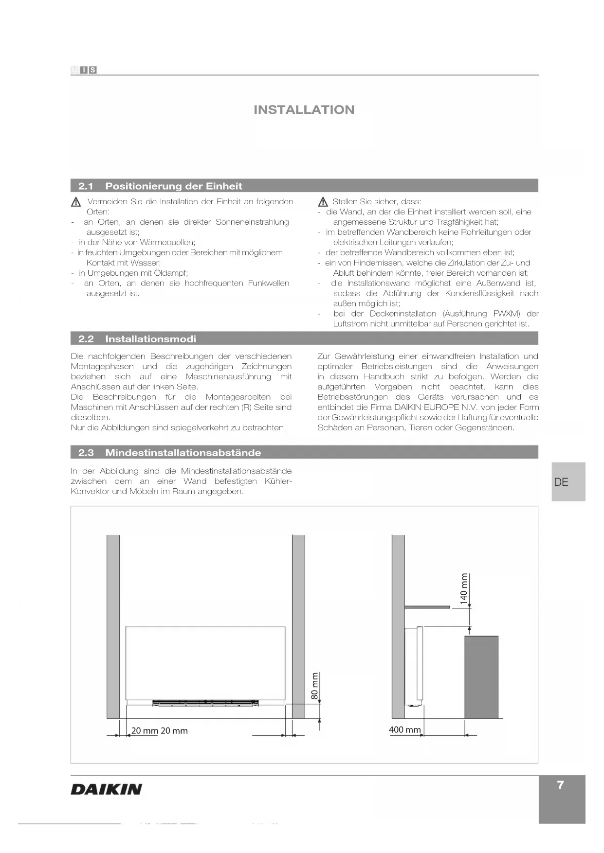 INSTALLATION Positionierung der Einheit Installationsmodi Vermeiden Sie die Installation der Einheit an folgenden Orten: - an Orten, an denen sie direkter Sonneneinstrahlung ausgesetzt ist; - in der Nähe von Wärmequellen; - in feuchten Umgebungen oder Bereichen mit möglichem Kontakt mit Wasser; - in Umgebungen mit Öldampf; - an Orten, an denen sie hochfrequenten Funkwellen ausgesetzt ist. Stellen Sie sicher, dass: - die Wand, an der die Einheit installiert werden soll, eine angemessene Struktur und Tragfähigkeit hat; - im betreffenden Wandbereich keine Rohrleitungen oder elektrischen Leitungen verlaufen; - der betreffende Wandbereich vollkommen eben ist; - ein von Hindernissen, welche die Zirkulation der Zu- und Abluft behindern könnte, freier Bereich vorhanden ist; - die Installationswand möglichst eine Außenwand ist, sodass die Abführung der Kondensflüssigkeit nach außen möglich ist; - bei der Deckeninstallation (Ausführung FWXM) der Luftstrom nicht unmittelbar auf Personen gerichtet ist. Die nachfolgenden Beschreibungen der verschiedenen Montagephasen und die zugehörigen Zeichnungen beziehen sich auf eine Maschinenausführung mit Anschlüssen auf der linken Seite. Die Beschreibungen für die Montagearbeiten bei Maschinen mit Anschlüssen auf der rechten (R) Seite sind dieselben. Nur die Abbildungen sind spiegelverkehrt zu betrachten. Zur Gewährleistung einer einwandfreien Installation und optimaler Betriebsleistungen sind die Anweisungen in diesem Handbuch strikt zu befolgen. Werden die aufgeführten Vorgaben nicht beachtet, kann dies Betriebsstörungen des Geräts verursachen und es entbindet die Firma DAIKIN EUROPE N.V. von jeder Form der Gewährleistungspflicht sowie der Haftung für eventuelle Schäden an Personen, Tieren oder Gegenständen. Mindestinstallationsabstände In der Abbildung sind die Mindestinstallationsabstände zwischen dem an einer Wand befestigten Kühler- Konvektor und Möbeln im Raum angegeben.8