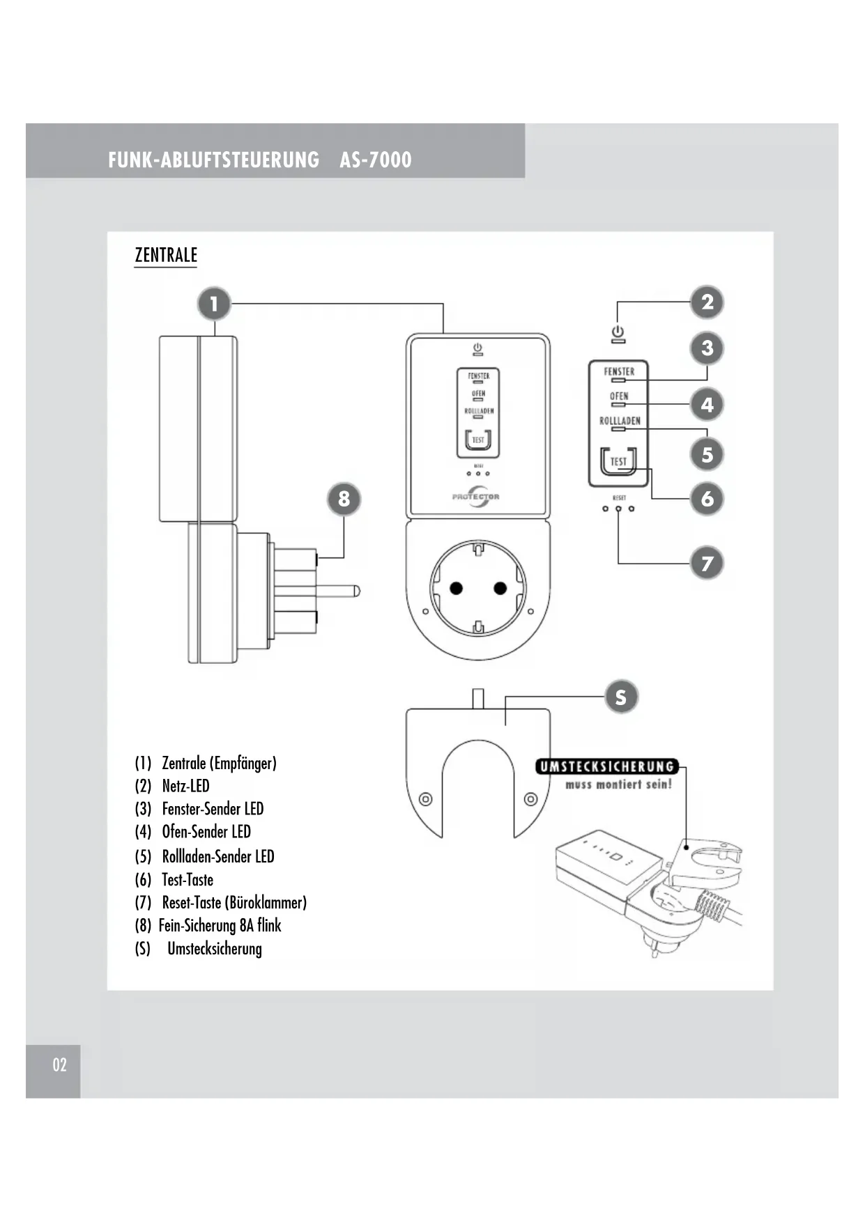 GEBRUIKSAANWIJZING 6802 FUNK-ABLUFTSTEUERUNG AS-7000 ZENTRALE (1) Zentrale (Empfänger) (2) Netz-LED (3) Fenster-Sender LED (4) Ofen-Sender LED (5) Rollladen-Sender LED (6) Test-Taste (7) Reset-Taste (Büroklammer) (8) Fein-Sicherung 8A flink (S) Umstecksicherung