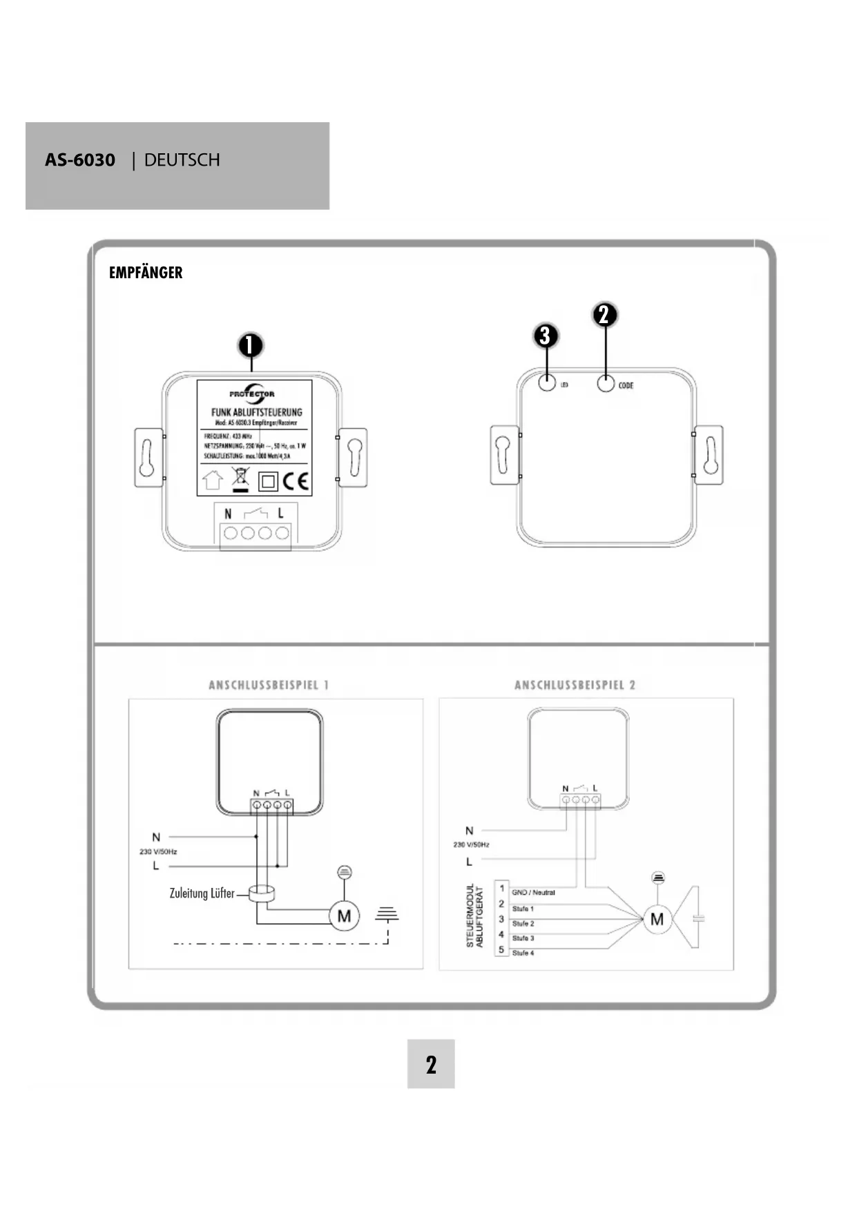 Die Montage muss durch eine Elektrofachkraft erfolgen! Achtung! Gerät nur innerhalb eines Gebäudes einsetzen! Anschlussbeispiel 1 Der Empfänger kann Auf- oder Unterputz in einer Verteiler-, Schalter- oder Steckdose mit min. 60 mm Durchmesser eingebaut werden. Anschlussbeispiel 2 Bei Abluftgeräten mit Gebläsestufenschaltung wird der Empfänger in die Lüftermotorzuleitung zwischengeschaltet, damit die Beleuchtung unabhängig vom Schaltzustand des Empfängers funktioniert (s. Zeichnung). ACHTUNG: Prüfen Sie immer, ob die Leistungsaufnahme des angeschlossenen Gerätes kleiner oder gleich der Schaltleistung ist.AS-6030 | DEUTSCH