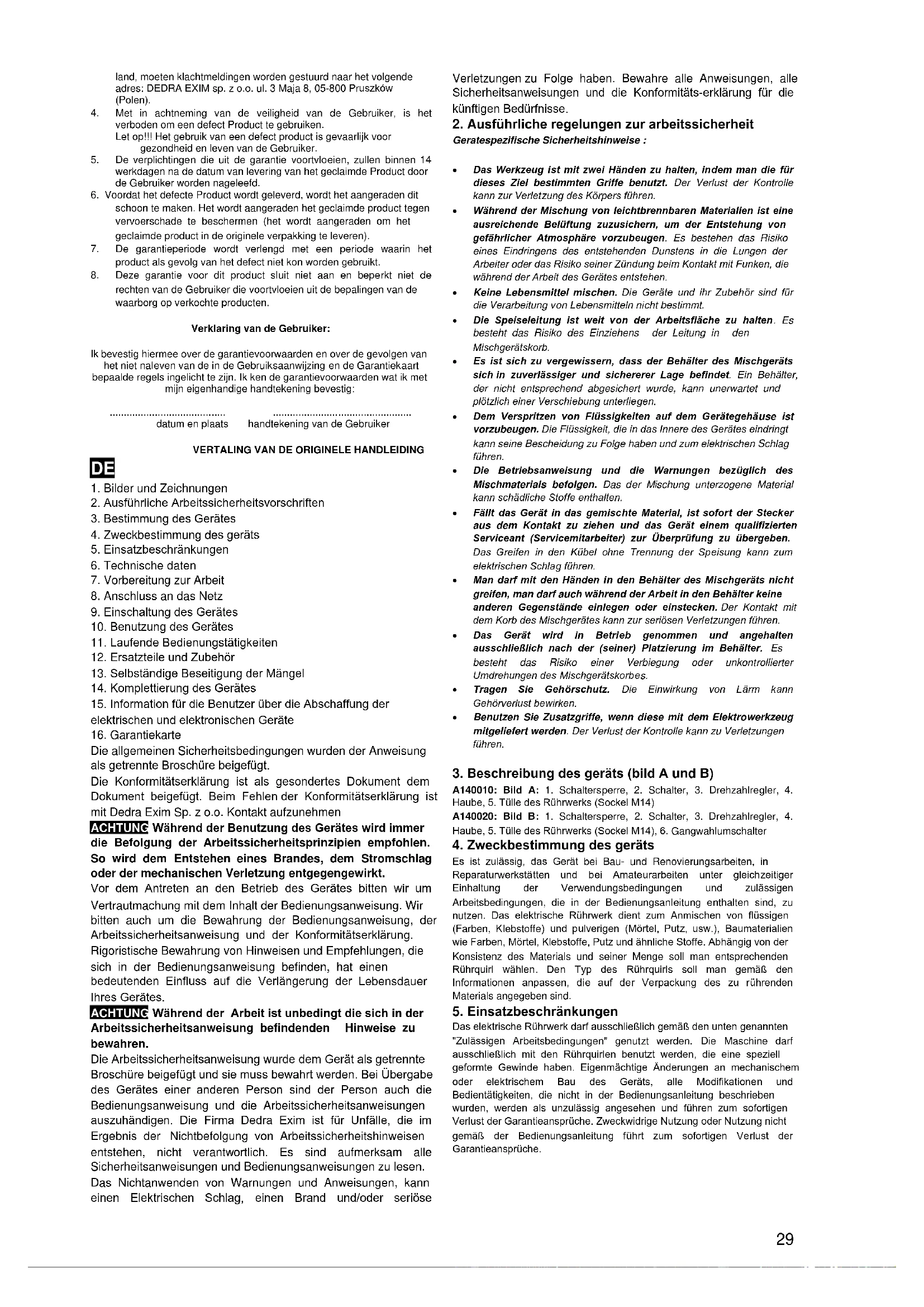Geratespezifische Sicherheitshinweise : Das Werkzeug ist mit zwei Händen zu halten, indem man die für dieses Ziel bestimmten Griffe benutzt. Der Verlust der Kontrolle kann zur Verletzung des Körpers führen. Während der Mischung von leichtbrennbaren Materialien ist eine ausreichende Belüftung zuzusichern, um der Entstehung von gefährlicher Atmosphäre vorzubeugen. Es bestehen das Risiko eines Eindringens des entstehenden Dunstens in die Lungen der Arbeiter oder das Risiko seiner Zündung beim Kontakt mit Funken, die während der Arbeit des Gerätes entstehen. Keine Lebensmittel mischen. Die Geräte und ihr Zubehör sind für die Verarbeitung von Lebensmitteln nicht bestimmt. Die Speiseleitung ist weit von der Arbeitsfläche zu halten. Es besteht das Risiko des Einziehens der Leitung in den Mischgerätskorb. Es ist sich zu vergewissern, dass der Behälter des Mischgeräts sich in zuverlässiger und sichererer Lage befindet. Ein Behälter, der nicht entsprechend abgesichert wurde, kann unerwartet und plötzlich einer Verschiebung unterliegen. Dem Verspritzen von Flüssigkeiten auf dem Gerätegehäuse ist vorzubeugen. Die Flüssigkeit, die in das Innere des Gerätes eindringt kann seine Bescheidung zu Folge haben und zum elektrischen Schlag führen. Die Betriebsanweisung und die Warnungen bezüglich des Mischmaterials befolgen. Das der Mischung unterzogene Material kann schädliche Stoffe enthalten. Fällt das Gerät in das gemischte Material, ist sofort der Stecker aus dem Kontakt zu ziehen und das Gerät einem qualifizierten Serviceant (Servicemitarbeiter) zur Überprüfung zu übergeben. Das Greifen in den Kübel ohne Trennung der Speisung kann zum elektrischen Schlag führen. Man darf mit den Händen in den Behälter des Mischgeräts nicht greifen, man darf auch während der Arbeit in den Behälter keine anderen Gegenstände einlegen oder einstecken. Der Kontakt mit dem Korb des Mischgerätes kann zur seriösen Verletzungen führen. Das Gerät wird in Betrieb genommen und angehalten ausschließlich nach der (seiner) Platzierung im Behälter. Es besteht das Risiko einer Verbiegung oder unkontrollierter Umdrehungen des Mischgerätskorbes. Tragen Sie Gehörschutz. Die Einwirkung von Lärm kann Gehörverlust bewirken. Benutzen Sie Zusatzgriffe, wenn diese mit dem Elektrowerkzeug mitgeliefert werden. Der Verlust der Kontrolle kann zu Verletzungen führen.