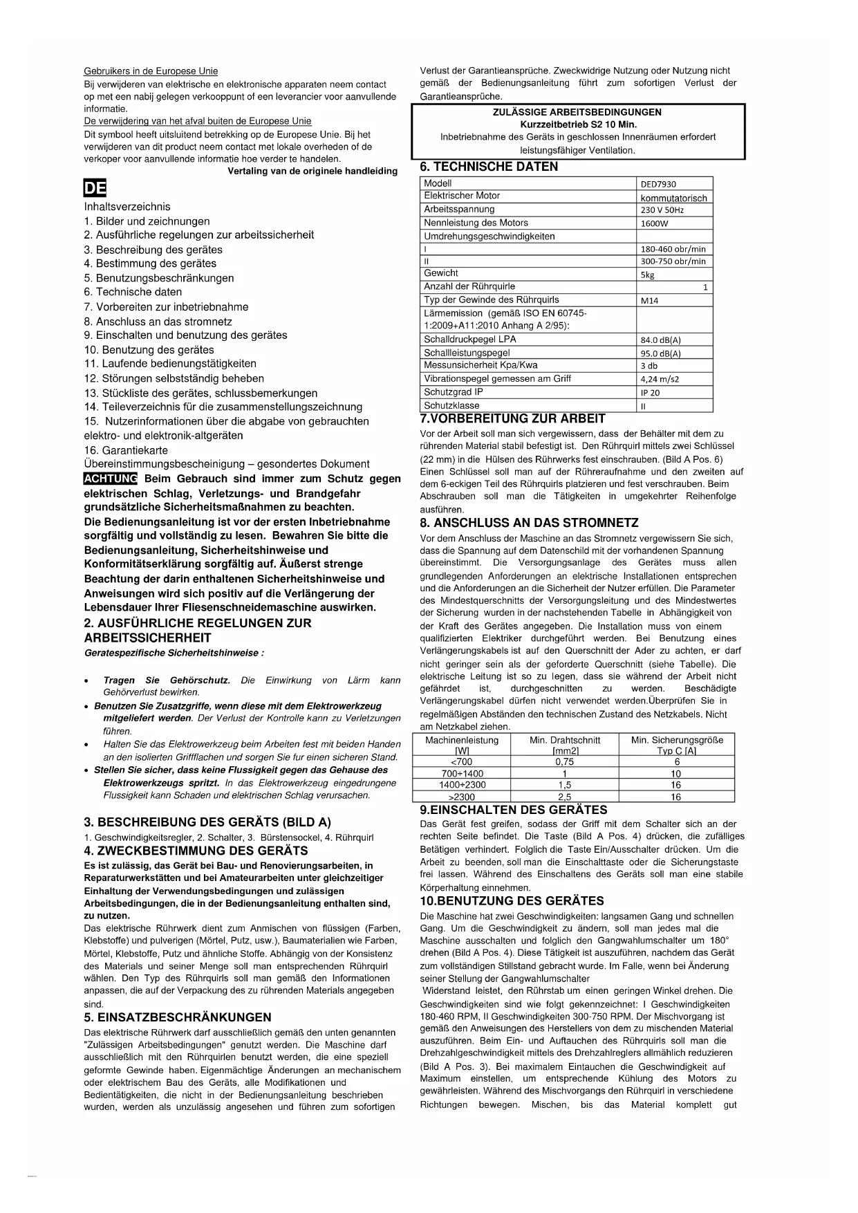 Kurzzeitbetrieb S2 10 Min. Inbetriebnahme des Geräts in geschlossen Innenräumen erfordert leistungsfähiger Ventilation.