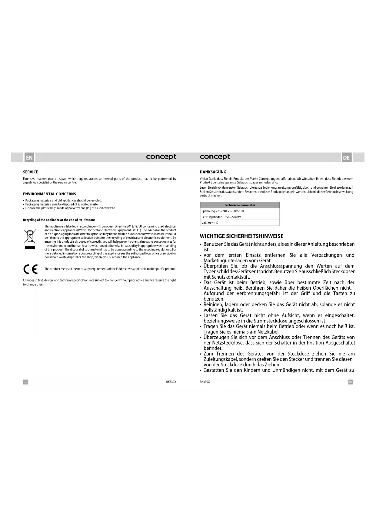 - Die Polyäthylen-Beutel (PE) geben Sie zum Recyceln des Sammelmaterials ab. Recycling des Gerätes am Ende seiner Lebensdauer: Dieses Gerät ist im Einklang mit der Europäischen Richtlinie 2012/19/EU über Elektro- und Elektronik- Altgeräte (WEEE) gekennzeichnet. Das Symbol am Produkt oder an dessen Verpackung gibt an, dass dieses Produkt nicht in den Haushaltsabfall gehört. Es ist auf eine Sammelstelle zum Recyceln der elektrischen und elektronischen Anlagen zu bringen. Durch die Sicherstellung der korrekten Entsorgung dieses Produktes helfen Sie, negative Konsequenzen für die Umwelt und die Gesundheit der Menschen zu verhindern, die durch die unsachgemäße Entsorgung dieses Produktes verursacht würden. Die Entsorgung muss im Einklang mit den Vorschriften für die Abfallbehandlung durchgeführt werden. Ausführlichere Informationen zum Recycling dieses Produkts erhalten Sie bei der zuständigen örtlichen Behörde, dem Dienstleister für Entsorgung von Haushaltsabfall oder in dem Geschäft, wo Sie das Produkt gekauft haben. Dieses Produkt erfüllt sämtliche Grundanforderungen der EU-Richtlinien, die sich darauf beziehen. Lebensmittel sind Die Änderungen im Text, im Design und in den technischen Spezifizierungen können ohne vorherigen Hinweis geändert werden, und wir behalten uns das Recht auf deren Änderungen vor. MERCI Nous vous remercions d’avoir acheté le produit de la marque Concept et nous espérons qu’il vous apportera votre entière satisfaction pendant son utilisation. Lire attentivement le manuel d’emploi avant la première utilisation et le conserver. Faire prendre connaissance du manuel d’emploi par les autres personnes pouvant manipuler le produit. Caractéristiques techniques Tension 220–240 V ~ 50/60 Hz Puissance 1850–2200 W Volume 1,5l PRÉCAUTIONS PARTICULIÈRES DE SÉCURITÉ