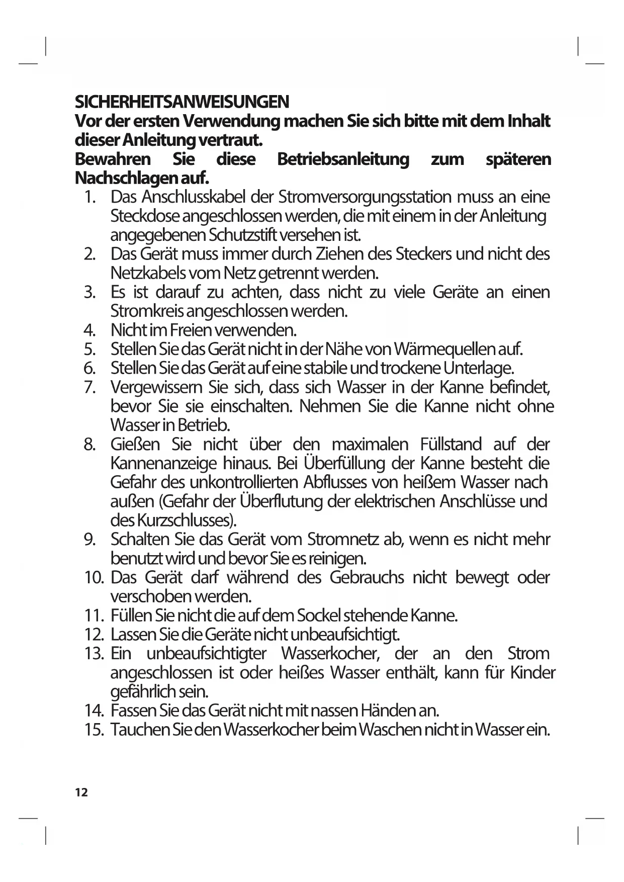 bevor Sie sie einschalten. Nehmen Sie die Kanne nicht ohne Wasser in Betrieb.
