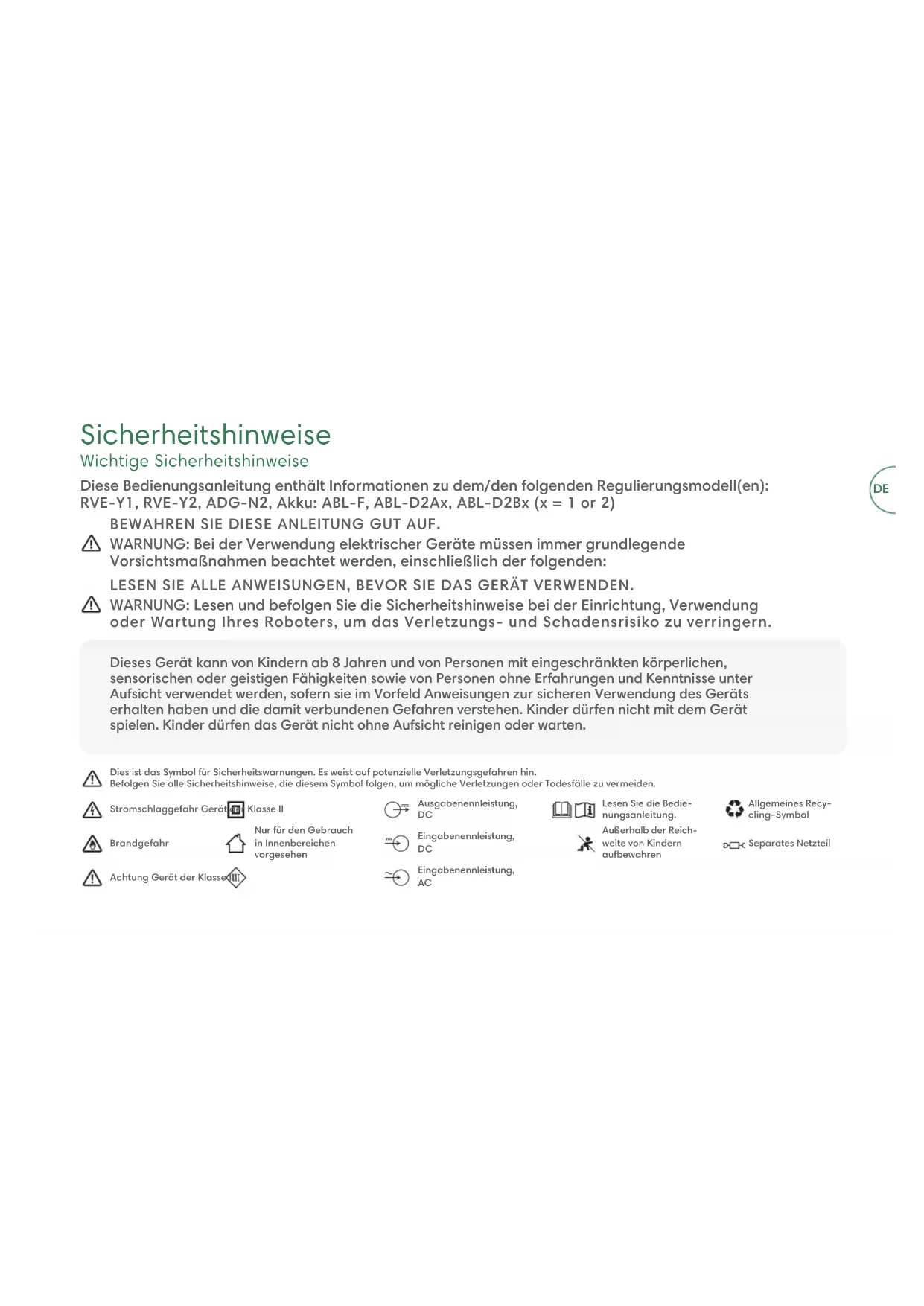 - Ihr Roboter ist mit einem für Ihre Region genehmigten Netzkabel ausgestattet und darf nur mit einer Standard-Haushaltssteckdose (AC) verbunden werden. Verwenden Sie kein anderes Netzkabel und keine andere Steckdose. Wenn Sie ein Ersatzkabel benötigen, wenden Sie sich an den Kundendienst, damit Sie das richtige Netzkabel für Ihr Land erhalten.• Öffnen Sie Ihren Roboter und Ihre Ladestation nicht, außer dies ist in der Bedienungsanleitung angegeben. Innen befinden sich keine vom Benutzer wartbaren Teile. Lassen Sie das Gerät von qualifiziertem Servicepersonal warten.• Gefahr von Stromschlägen: Verwenden Sie das Gerät nur in trockenen Innenräumen.• Verwenden Sie Ihren Roboter und Ladestation niemals mit nassen Händen. • Verwenden Sie keine nicht autorisierten Ladegeräte. Die Verwendung eines nicht autorisierten Ladegeräts kann dazu führen, dass der Akku Hitze oder Rauch abgibt, in Brand gerät oder explodiert.• Ihr Roboter ist kein Spielzeug. Während Ihr Roboter in Betrieb ist, sollten kleine Kinder und Haustiere beaufsichtigt werden. • Niemals auf dem Roboter oder der Ladestation sitzen oder stehen.• Lagern und betreiben Sie Ihren Roboter nur bei Zimmertemperatur.• Falls der zu reinigende Raum über einen Balkon verfügt, sollte eine physische Barriere verwendet werden, um den Zugang zum Balkon für den Roboter zu verhindern und einen sicheren Betrieb zu gewährleisten.• Wenn sich in dem zu reinigenden Raum Geräte wie z. B. ein Ofen, ein Ventilator, eine Standheizung oder ein Luftbefeuchter befinden, entfernen Sie die Geräte vor dem Betrieb. Es besteht die Gefahr von Verletzungen, Unfällen oder Fehlfunktionen, wenn der Roboter mit solchen Geräten in Berührung kommt und gegen sie stößt.• Lassen Sie nicht zu, dass der Roboter oder die Ladestation nass wird.• Beachten Sie, dass die Böden nach der Nassreinigung mit Ihrem Roboter rutschig sein können.• Reinigen Sie die Abgrundsensoren von Ablagerungen. ACHTUNG