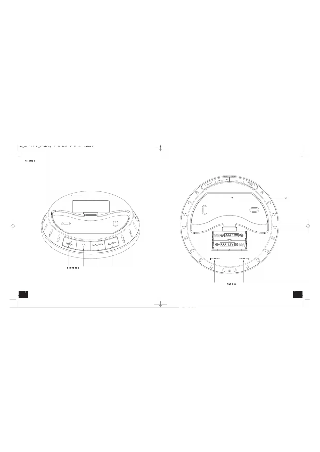 A 11: Luftdrucktendenz A 12: Relativer Luftdruck A 13: Automatische Rückstellung der Max.-Min.-Werte A 14: Luftdruckdifferenz letzte Stunde A 15: Symbol für Außenwerte* A 16: Symbol für Innenwerte A 17: Temperatur A 18: Kanalnummer mit Symbol automatischer Kanalwechsel* A 19: Batteriesymbol Sender* A 20: Empfangssignal Sender* *Anzeige nur bei Betrieb mit Außensender (optional) B: Tasten (Fig. 2): B 1: SET/MODE Taste B 2: CH/+ Taste B 3: MAX/MIN/– Taste B 4: ALARM Taste C: Gehäuse (Fig. 3): C 1: Halter zur Wandmontage C 2: Batteriefach C 3: Fixierpunkte für den Halter als Standfuß