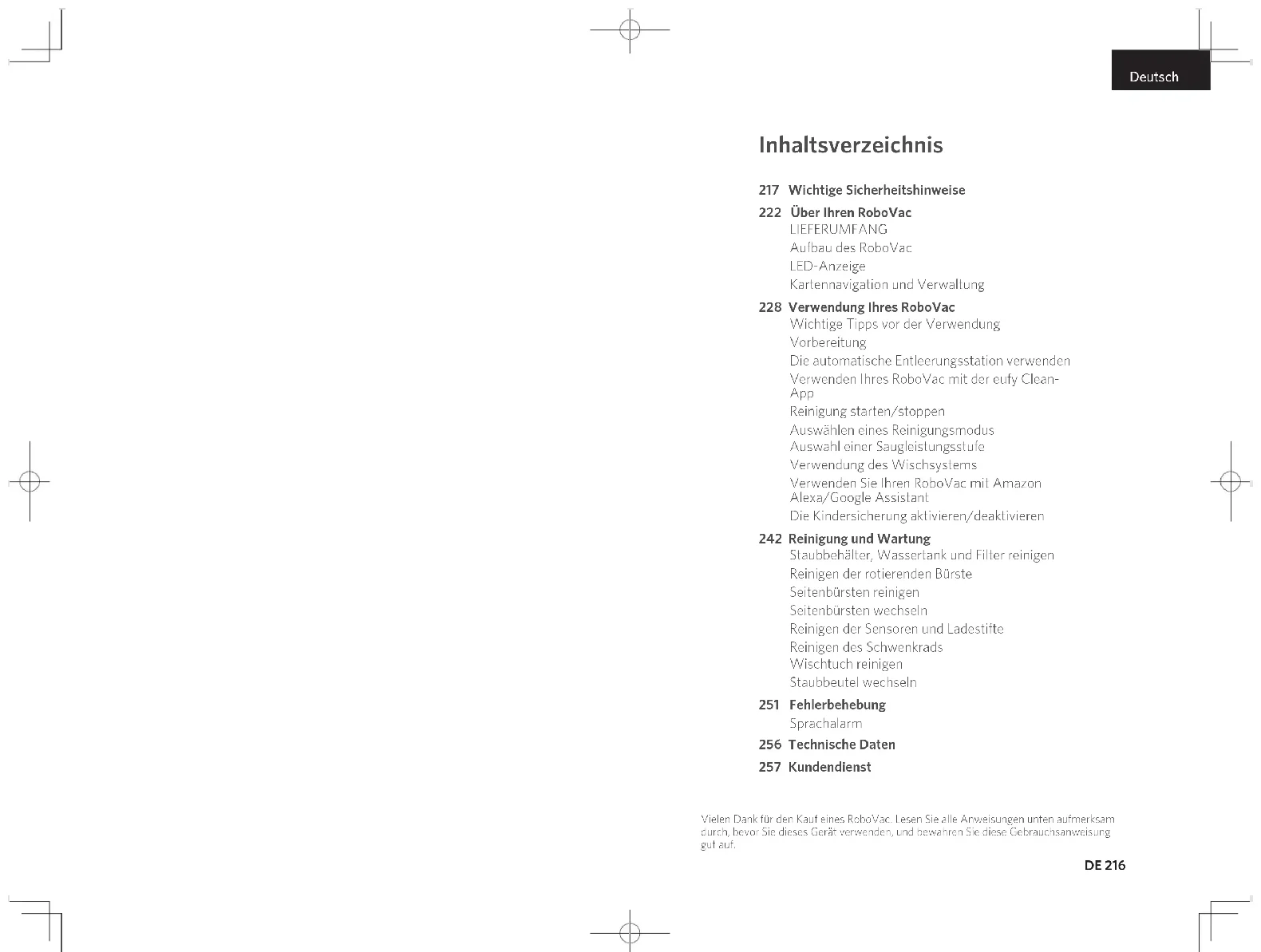 - Als het probleem aanhoudt, kunt u contact opnemen met de klantenservice. Specificaties Ingang 24 V 1 A Accuspanning 14,4 V Energieverbruik 50 W Accutype Li-ion, 3200 mAh (standaard) Capaciteit opvangbak 200 ml Capaciteit waterreservoir 200 ml Oplaadtijd 180 – 240 minuten Klantenservice Neem contact met ons op support@eufylife.com www.eufylife.com (US/CA) +1 (800) 994 3056 (UK) +44 (0) 1604 936200 (DE) +49 (0) 69 9579 7960 (日本) +81 03 4455 7823 Ga voor meer telefoonnummers voor ondersteuning naar: https://support.eufylife.com/s/ phonecontactus Of scan onderstaande QR-code: Ga voor instructievideo’s, veelgestelde vragen, handleidingen en meer informatie naar: https://support.eufylife.com Of scan onderstaande QR-code:Deutsch DE 216 Vielen Dank für den Kauf eines RoboVac. Lesen Sie alle Anweisungen unten aufmerksam durch, bevor Sie dieses Gerät verwenden, und bewahren Sie diese Gebrauchsanweisung gut auf. Inhaltsverzeichnis 217 Wichtige Sicherheitshinweise 222 Über Ihren RoboVac LIEFERUMFANG Aufbau des RoboVac LED-Anzeige Kartennavigation und Verwaltung 228 Verwendung Ihres RoboVac Wichtige Tipps vor der Verwendung Vorbereitung Die automatische Entleerungsstation verwenden Verwenden Ihres RoboVac mit der eufy Clean- App Reinigung starten/stoppen Auswählen eines Reinigungsmodus Auswahl einer Saugleistungsstufe Verwendung des Wischsystems Verwenden Sie Ihren RoboVac mit Amazon Alexa/Google Assistant Die Kindersicherung aktivieren/deaktivieren 242 Reinigung und Wartung Staubbehälter, Wassertank und Filter reinigen Reinigen der rotierenden Bürste Seitenbürsten reinigen Seitenbürsten wechseln Reinigen der Sensoren und Ladestifte Reinigen des Schwenkrads Wischtuch reinigen Staubbeutel wechseln 251 Fehlerbehebung Sprachalarm 256 Technische Daten 257 KundendienstDeutsch Deutsch 217 DE DE 218 Wichtige Sicherheitshinweise Halten Sie diese Anweisung bei der Einrichtung, Verwendung und Wartung dieses Gerätes griffbereit, um das Risiko von Verletzungen und Beschädigungen zu verringern. VERWENDETE WARNSYMBOLE Dies ist das Sicherheitswarnsymbol. Dieses Symbol weist Sie auf mögliche Gefahren hin, die zu Sachschäden und/oder schweren Verletzungen oder Todesfällen führen können.