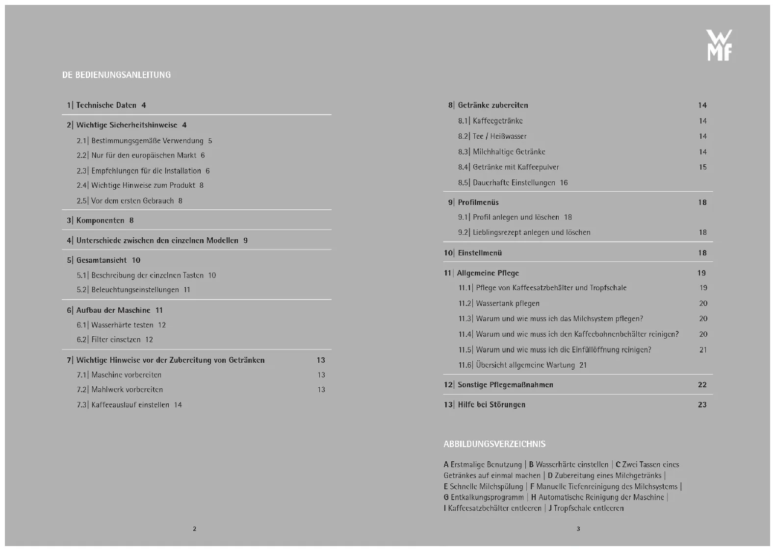 DE Bedienungsanleitung 2 EN Operating Instructions 28 FR Notice d’utilisation 54 ES Instrucciones de uso 80 IT Istruzioni per l’uso 106 CS Návod k obsluze 132 DA Betjeningsvejledning 158 FI Käyttöohje 184 NL Gebruiksaanwijzing 210 NO Bruksanvisning 236 PL Instrukcja obsługi 262 PT Manual de instruções 288 RO Instrucţiuni de utilizare 314 RU Инструкция по эксплуатации 340 SV Bruksanvisning 366 TR Kullanım Talimatları 392 WMF PERFECTION 700-SERIESDE BEDIENUNGSANLEITUNG 1|Technische Daten 4 2|Wichtige Sicherheitshinweise 4 2.1|Bestimmungsgemäße Verwendung 5 2.2|Nur für den europäischen Markt 6 2.3|Empfehlungen für die Installation 6 2.4|Wichtige Hinweise zum Produkt 8 2.5|Vor dem ersten Gebrauch 8 3|Komponenten 8 4|Unterschiede zwischen den einzelnen Modellen 9 5|Gesamtansicht 10 5.1|Beschreibung der einzelnen Tasten 10 5.2|Beleuchtungseinstellungen 11 6|Aufbau der Maschine 11 6.1|Wasserhärte testen 12 6.2|Filter einsetzen 12 7|Wichtige Hinweise vor der Zubereitung von Getränken 13 7.1|Maschine vorbereiten 13 7.2|Mahlwerk vorbereiten 13 7.3|Kaffeeauslauf einstellen 14 DE BEDIENUNGSANLEITUNG 8|Getränke zubereiten 14 8.1|Kaffeegetränke 14 8.2|Tee / Heißwasser 14 8.3|Milchhaltige Getränke 14 8.4|Getränke mit Kaffeepulver 15 8.5|Dauerhafte Einstellungen 16 9|Profilmenüs 18 9.1|Profil anlegen und löschen 18 9.2|Lieblingsrezept anlegen und löschen 18 10|Einstellmenü 18 11|Allgemeine Pflege 19 11.1|Pflege von Kaffeesatz behälter und Tropfschale 19 11.2|Wassertank pflegen 20 11.3|Warum und wie muss ich das Milchsystem pflegen? 20 11.4|Warum und wie muss ich den Kaffeebohnenbehälter reinigen? 20 11.5|Warum und wie muss ich die Einfüllöffnung reinigen? 21 11.6|Übersicht allgemeine Wartung 21 12|Sonstige Pflegemaßnahmen 22 13|Hilfe bei Störungen 23 ABBILDUNGSVERZEICHNIS A Erstmalige Benutzung | B Wasserhärte einstellen | C Zwei Tassen eines Getränkes auf einmal machen | D Zubereitung eines Milchgetränks | E Schnelle Milchspülung | FManuelle Tiefenreinigung des Milchsystems | GEntkalkungsprogramm | HAutomatische Reinigung der Maschine | IKaffeesatzbehälter entleeren | JTropfschale entleeren