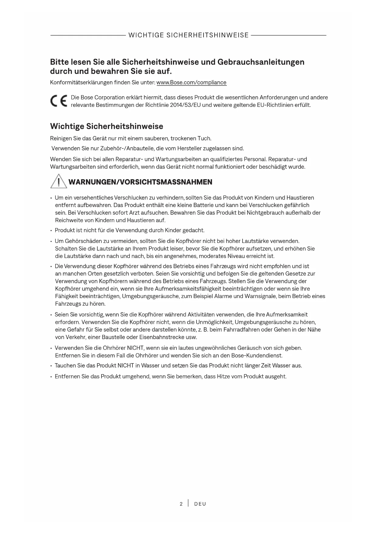 DEU Bitte lesen Sie alle Sicherheitshinweise und Gebrauchsanleitungen durch und bewahren Sie sie auf. Konformitätserklärungen finden Sie unter: www.Bose.com/compliancewww.Bose.com/compliance Die Bose Corporation erklärt hiermit, dass dieses Produkt die wesentlichen Anforderungen und andere relevante Bestimmungen der Richtlinie 2014/53/EU und weitere geltende EU-Richtlinien erfüllt. Wichtige Sicherheitshinweise Reinigen Sie das Gerät nur mit einem sauberen, trockenen Tuch. Verwenden Sie nur Zubehör-/Anbauteile, die vom Hersteller zugelassen sind. Wenden Sie sich bei allen Reparatur- und Wartungsarbeiten an qualifiziertes Personal. Reparatur- und Wartungsarbeiten sind erforderlich, wenn das Gerät nicht normal funktioniert oder beschädigt wurde. WARNUNGEN/VORSICHTSMASSNAHMEN