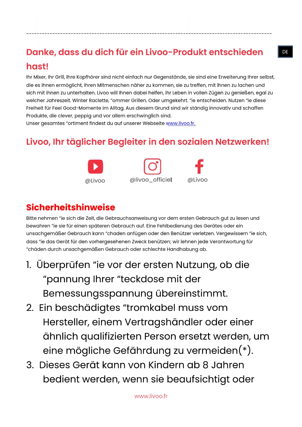 @Livoo DEwww.livoo.fr bezüglich der Bedienung instruiert wurden und die Gefahren der Bedienung kennen. Die Reinigung und die Unterhaltung vom Benutzer sollen von Kindern nicht ausgeführt sein, es sei denn, daß sie über 8 Jahre alt sind und es sei denn, daß sie unter Aufsicht einer Erwachsenen sind.