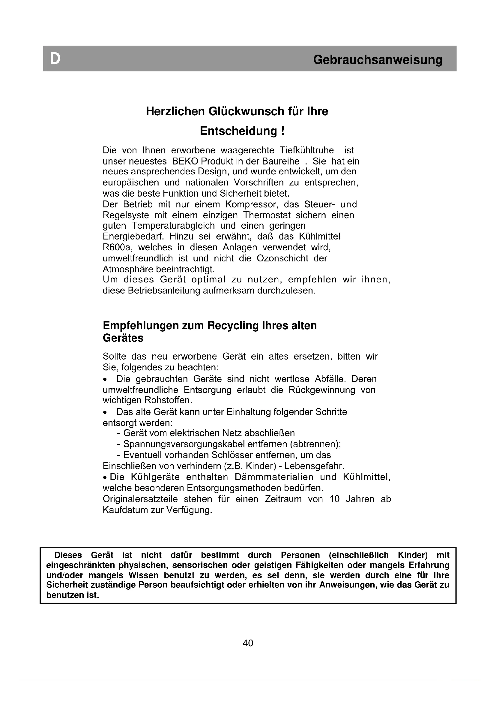 D Gebrauchsanweisung Dieses Gerät ist nicht dafür bestimmt durch Personen (einschließlich Kinder) mit eingeschränkten physischen, sensorischen oder geistigen Fähigkeiten oder mangels Erfahrung und/oder mangels Wissen benutzt zu werden, es sei denn, sie werden durch eine für ihre Sicherheit zuständige Person beaufsichtigt oder erhielten von ihr Anweisungen, wie das Gerät zu benutzen ist.Recycling der Verpackung Vorsicht! Gestatten Sie den Kindern nicht, mit der Verpackung oder mit Teilen der Verpackung zu speilen. Es besteht Erstickungsgefahr durch Wellpapier oder Kunststoffolie. Um eine Beschädigung des Gerätes beim Transport zu verhindern, wurden alle Materialien der Verpackung entsprechend den Vorschriften zur umweltfreundlichen Entsorgung entwickelt. Wir empfehlen die Verwertung der Verpackung, um die Umwelt zu schonen! WICHTIG! Lesen Sie diese Anweisungen vollständig vor der Inbetriebnahme des Gerätes. Sie beinhalten wichtige Informationen zu der Aufstellung, dem Betrieb und der Wartung Ihres Gerätes. Bewahren sie die Gebrauchsanweisungen sicher auf, um auch später leicht zugänglich zu sein, Sie sind auch weiteren Benutzern des Gerätas sehr behilflich. WICHTIG! Dieses Gerät ist nur für die vorgesehenen Zwecke zu betreiben (Haushalt), in entsprechenden Räumen, vor Regen, Feuchtigkeit oder anderen Umwelteinflüssen geschützt. Transportvorschriften Wir empfehlen, das Gerät auch beim Transport nur in waagerechter Position zu halten. Während dem Transport muß die Verpackung unbeschädigt sein. Vor der Inbetriebnahme lassen Sie das Gerät für 4 Stunden stehen. Beim Transport sollte jedwelche Einwirkung auf den Kühlkreislauf vermieden werden (Gefahr von Verformungen an den Leitungen). Die Nicheinhaltung dieser Vorschriften kann zu Schäden an dem Motorkompressor führen und zum Erlöschen der Gewährleistung für das Gerät. Allgemeine Vorsichtsmaßnahmen und Empfehlungen Nehmen Sie das Gerät nicht in Betrieb, wenn ein Fehler daran bemerkt wurde. Vermeiden Sie die Verformung des Kühlmittelkreislaufes (Leitungen) beim Transport und bei der Aufstellung des Gerätes. Die Tiefkühltruhe sollte nur zur Aufbewahrung von tiefgefrorenen Lebensmitteln, das Tieffrieren von frischen Lebesmitteln und für die Herstellung von Eiswürfeln verwendet werden. Lassen sie dei Türe des Gerätes nicht länger offen, als zum Herausnehmen oder Einlegen von Lebensmitteln notwendig ist. Im inneren dürfen keine Produkte gehalten werden, welche brennbare oder explisive Gase enthalten. Verzehren Sie nicht Eiswürfel gleich nachdem sie aus der Tiefköhltruhe geholt wurden. Sie können Frostbiss verursachen. Berühren Sie niemals kalte metallische Teile oder tiefgefrorene Lebensmittel mit freuchten Händen. Ihre Hand kann sehr schnelll an die sehr kalten Oberflächen anfrieren. Verbieten Sie den Kindern, sich hinter dem Gerät zu verstecken oder da zu spielen. Vor jedwelcher Reinigungsarbeit ist das Gerät von dem Spannungsnetz zu trennen. Um das Gerät vom Netz zu trennen, ziehen Sie an dem Stecker, nicht am Kabel! Steigen Sie nicht auf das Gerät. Betreiben Sie nicht das Gerät in der Nähe von Heizkörpern, Kochöfen oder anderen Hitzequellen oder neben Feuer. Zum Schutz des Gerätes bei Lagerung und Transport befinden sich Distanzstücke zwischen Tür und Gehäuse (vorne und hinten). Diese Distanzstücke werden entfernt, bevor das Gerät in Betrieb genommen wird. Überschüssiges Eis an Rahmen und Ablagen sollte regelmäßig mit dem mitgelieferten Plastikschaber entfernt werden. Nutzen Sie keine Metallgegenstände zur Eisentfernung. Durch Eisansammlung lässt sich die Tür nicht mehr richtig schließen.