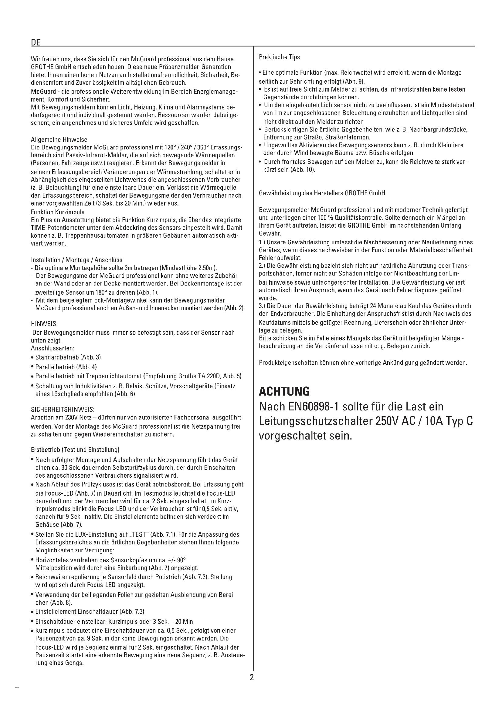 - Durch frontales Bewegen auf den Melder zu, kann die Reichweite stark ver- kürzt sein (Abb. 10). Gewährleistung des Herstellers GROTHE GmbH Bewegungsmelder McGuard professional sind mit moderner Technik gefertigt und unterliegen einer 100 % Qualitätskontrolle. Sollte dennoch ein Mängel an Ihrem Gerät auftreten, leistet die GROTHE GmbH im nachstehenden Umfang Gewähr. 1.) Unsere Gewährleistung umfasst die Nachbesserung oder Neulieferung eines Gerätes, wenn dieses nachweisbar in der Funktion oder Materialbeschaffenheit Fehler aufweist. 2.) Die Gewährleistung bezieht sich nicht auf natürliche Abnutzung oder Trans- portschäden, ferner nicht auf Schäden infolge der Nichtbeachtung der Ein- bauhinweise sowie unfachgerechter Installation. Die Gewährleistung verliert automatisch ihren Anspruch, wenn das Gerät nach Fehlerdiagnose geöffnet wurde. 3.) Die Dauer der Gewährleistung beträgt 24 Monate ab Kauf des Gerätes durch den Endverbraucher. Die Einhaltung der Anspruchsfrist ist durch Nachweis des Kaufdatums mittels beigefügter Rechnung, Lieferschein oder ähnlicher Unter- lage zu belegen. Bitte schicken Sie im Falle eines Mangels das Gerät mit beigefügter Mängel- beschreibung an die Verkäuferadresse mit o. g. Belegen zurück. Produkteigenschaften können ohne vorherige Ankündigung geändert werden. ACHTUNG Nach EN60898-1 sollte für die Last ein Leitungsschutzschalter 250V AC / 10A Typ C vorgeschaltet sein. 2McGuard professional 120° 240° 360° Artikel-Nummer: