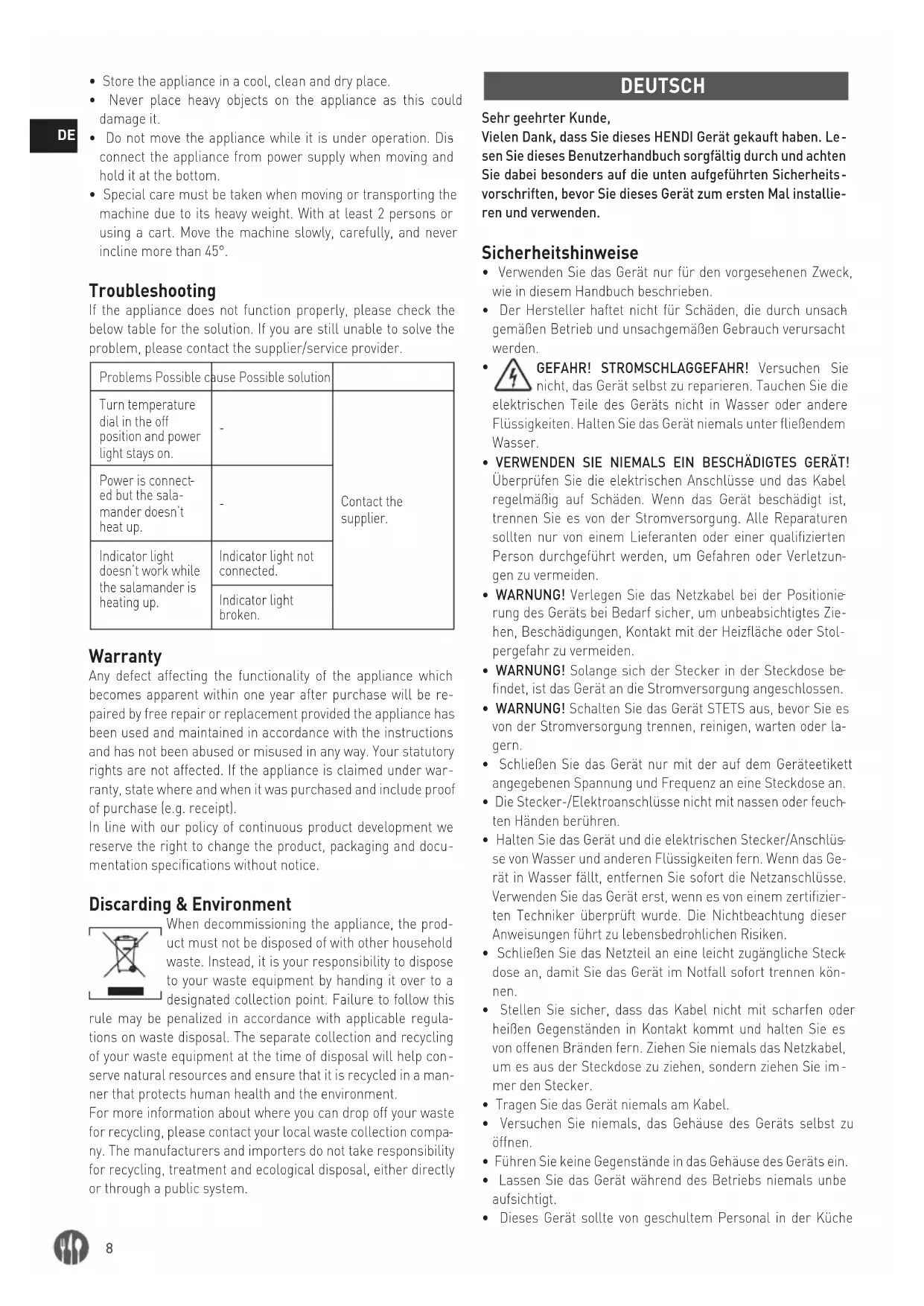 - Dieses Gerät sollte von geschultem Personal in der Küche9