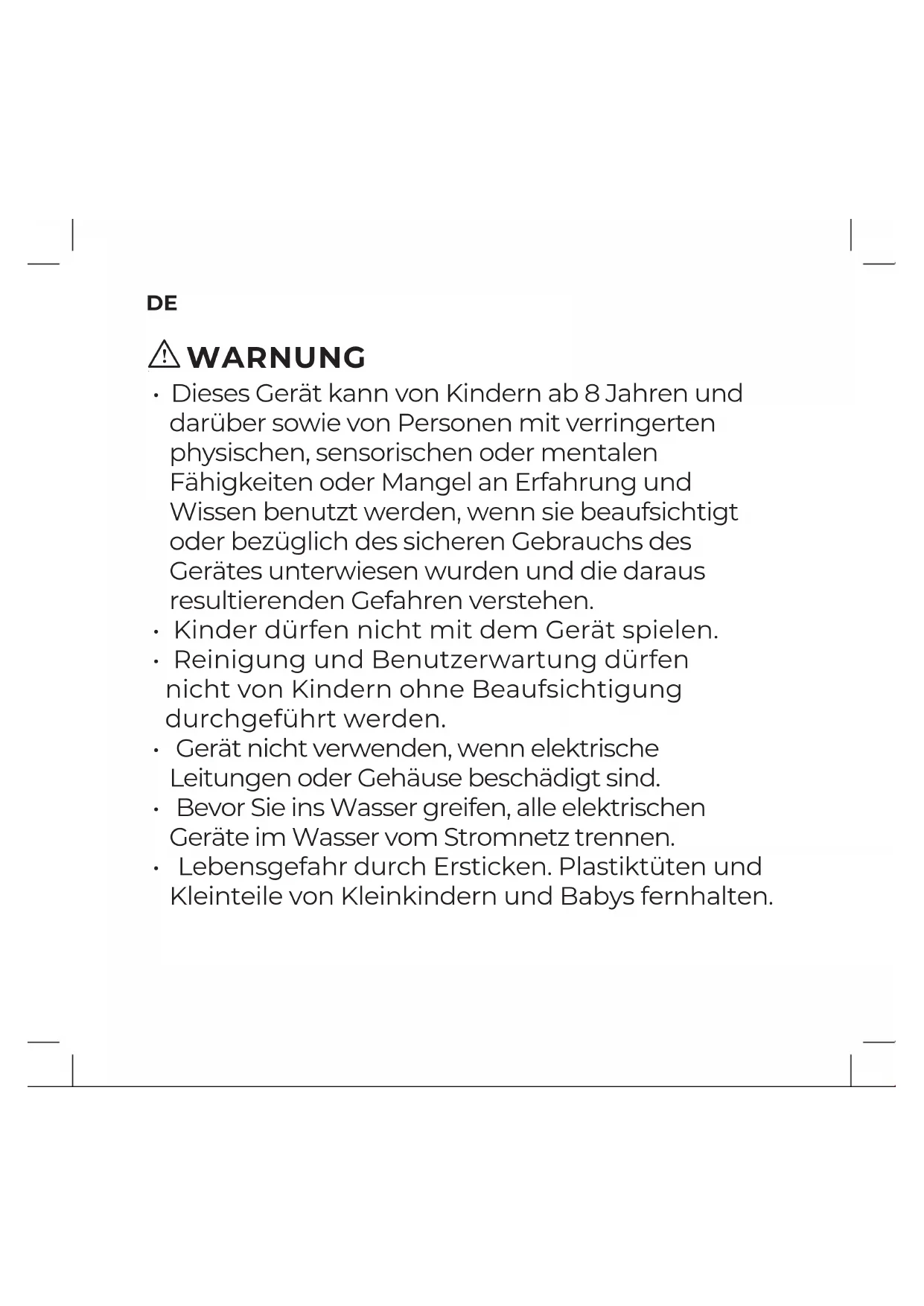 - Reinigung und Benutzerwartung dürfen nicht von Kindern ohne Beaufsichtigung durchgeführt werden.