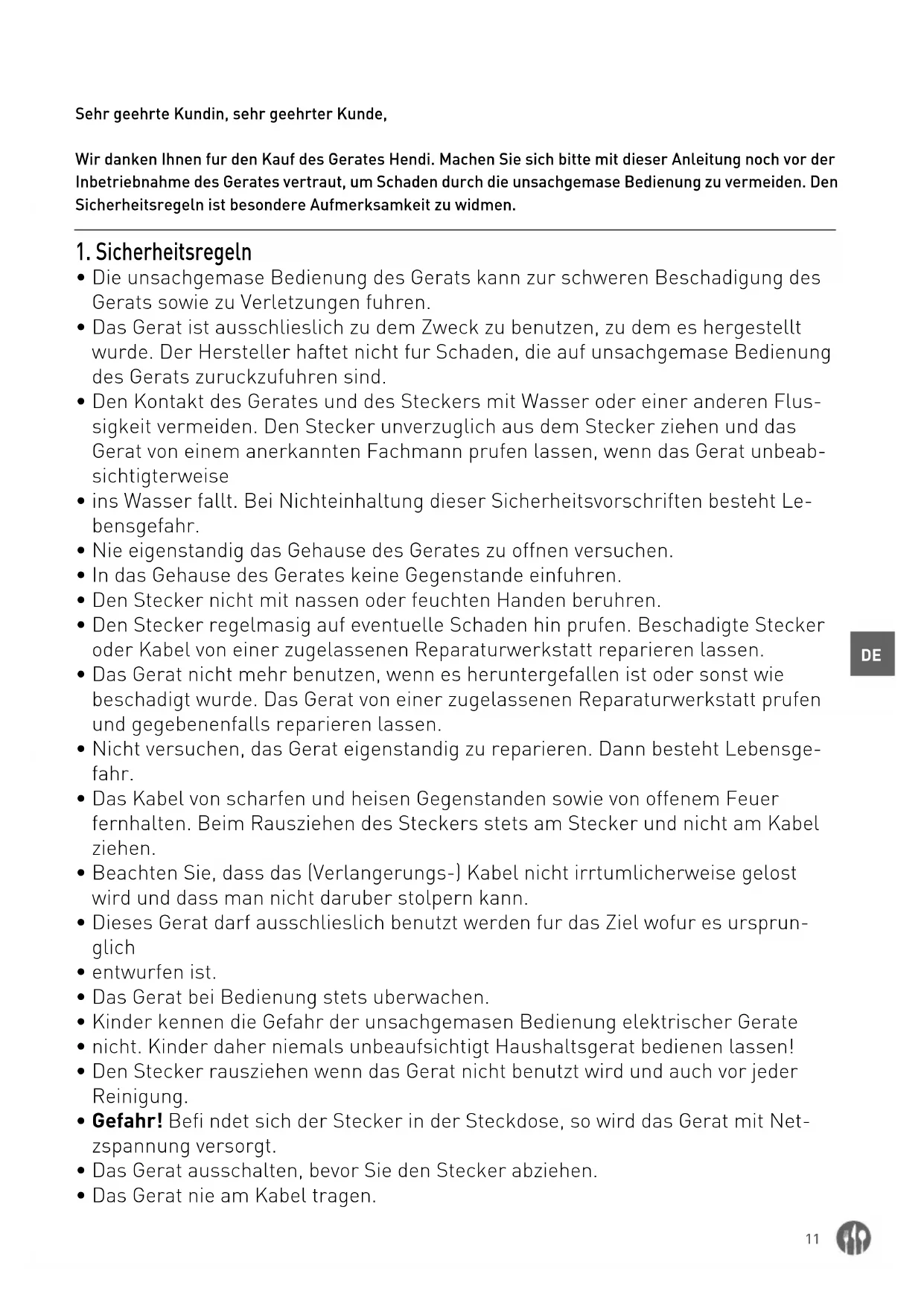 Sehr geehrte Kundin, sehr geehrter Kunde, Wir danken Ihnen fur den Kauf des Gerates Hendi. Machen Sie sich bitte mit dieser Anleitung noch vor der Inbetriebnahme des Gerates vertraut, um Schaden durch die unsachgemase Bedienung zu vermeiden. Den Sicherheitsregeln ist besondere Aufmerksamkeit zu widmen.