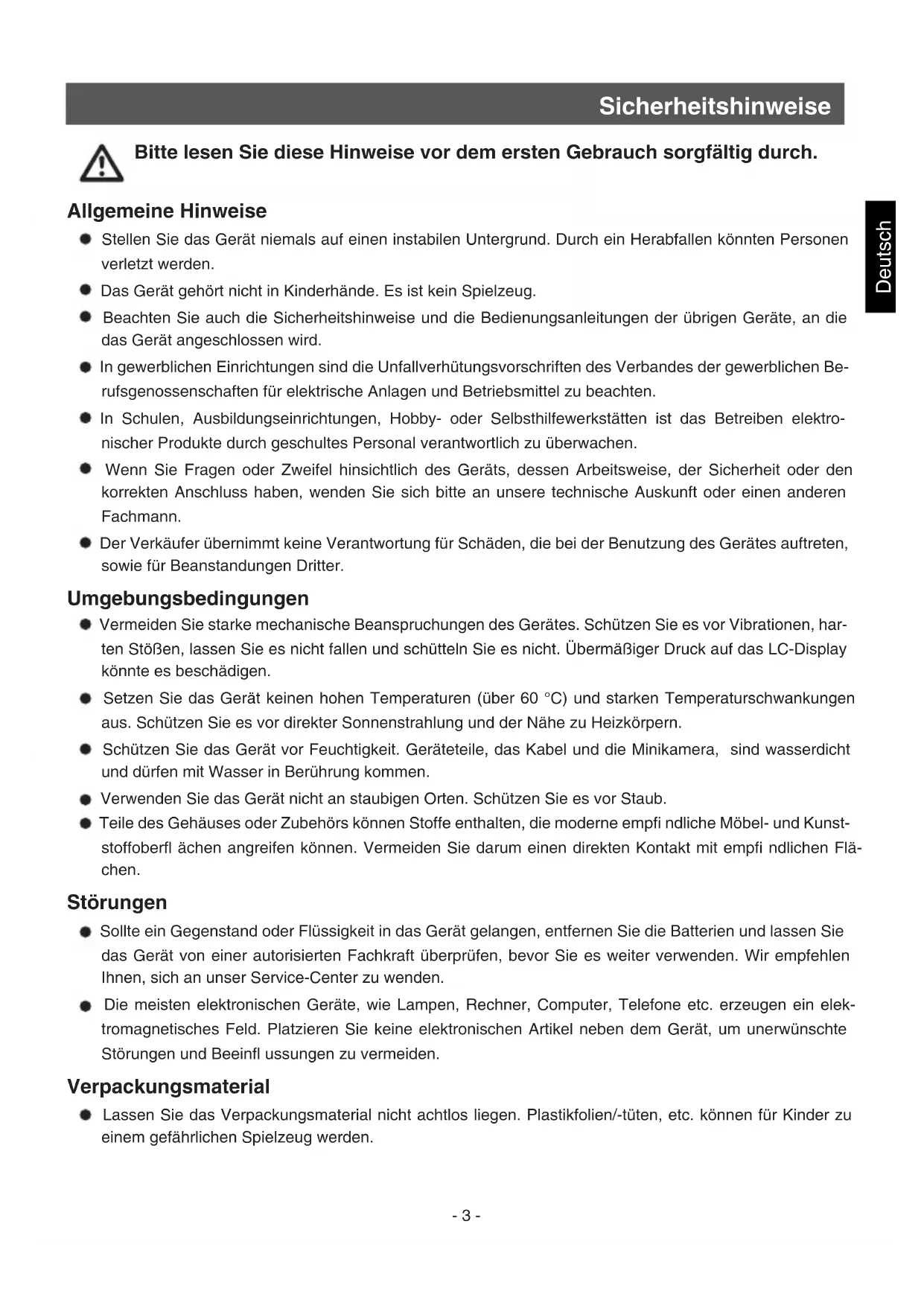 - Garantiebestimmungen - 3 - Deutsch Sicherheitshinweise Bitte lesen Sie diese Hinweise vor dem ersten Gebrauch sorgfältig durch. Allgemeine Hinweise Stellen Sie das Gerät niemals auf einen instabilen Untergrund. Durch ein Herabfallen könnten Personen verletzt werden. Das Gerät gehört nicht in Kinderhände. Es ist kein Spielzeug. Beachten Sie auch die Sicherheitshinweise und die Bedienungsanleitungen der übrigen Geräte, an die das Gerät angeschlossen wird. In gewerblichen Einrichtungen sind die Unfallverhütungsvorschriften des Verbandes der gewerblichen Be- rufsgenossenschaften für elektrische Anlagen und Betriebsmittel zu beachten. In Schulen, Ausbildungseinrichtungen, Hobby- oder Selbsthilfewerkstätten ist das Betreiben elektro- nischer Produkte durch geschultes Personal verantwortlich zu überwachen. Wenn Sie Fragen oder Zweifel hinsichtlich des Geräts, dessen Arbeitsweise, der Sicherheit oder den korrekten Anschluss haben, wenden Sie sich bitte an unsere technische Auskunft oder einen anderen Fachmann. Der Verkäufer übernimmt keine Verantwortung für Schäden, die bei der Benutzung des Gerätes auftreten, sowie für Beanstandungen Dritter. Umgebungsbedingungen Vermeiden Sie starke mechanische Beanspruchungen des Gerätes. Schützen Sie es vor Vibrationen, har- ten Stößen, lassen Sie es nicht fallen und schütteln Sie es nicht. Übermäßiger Druck auf das LC-Display könnte es beschädigen. Setzen Sie das Gerät keinen hohen Temperaturen (über 60 °C) und starken Temperaturschwankungen aus. Schützen Sie es vor direkter Sonnenstrahlung und der Nähe zu Heizkörpern. Schützen Sie das Gerät vor Feuchtigkeit. Geräteteile, das Kabel und die Minikamera, sind wasserdicht und dürfen mit Wasser in Berührung kommen. Verwenden Sie das Gerät nicht an staubigen Orten. Schützen Sie es vor Staub. Teile des Gehäuses oder Zubehörs können Stoffe enthalten, die moderne empfi ndliche Möbel- und Kunst- stoffoberfl ächen angreifen können. Vermeiden Sie darum einen direkten Kontakt mit empfi ndlichen Flä- chen. Störungen Sollte ein Gegenstand oder Flüssigkeit in das Gerät gelangen, entfernen Sie die Batterien und lassen Sie das Gerät von einer autorisierten Fachkraft überprüfen, bevor Sie es weiter verwenden. Wir empfehlen Ihnen, sich an unser Service-Center zu wenden. Die meisten elektronischen Geräte, wie Lampen, Rechner, Computer, Telefone etc. erzeugen ein elek- tromagnetisches Feld. Platzieren Sie keine elektronischen Artikel neben dem Gerät, um unerwünschte Störungen und Beeinfl ussungen zu vermeiden. Verpackungsmaterial Lassen Sie das Verpackungsmaterial nicht achtlos liegen. Plastikfolien/-tüten, etc. können für Kinder zu einem gefährlichen Spielzeug werden.Deutsch p. 35